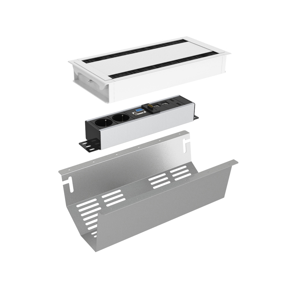 Paketet är utformat för moderna mötesrum där tillgång till el, data och bild är avgörande. Duo-locket ger ett diskret utseende när uttagen inte används, samtidigt som alla anslutningar är lättåtkomliga under möten.