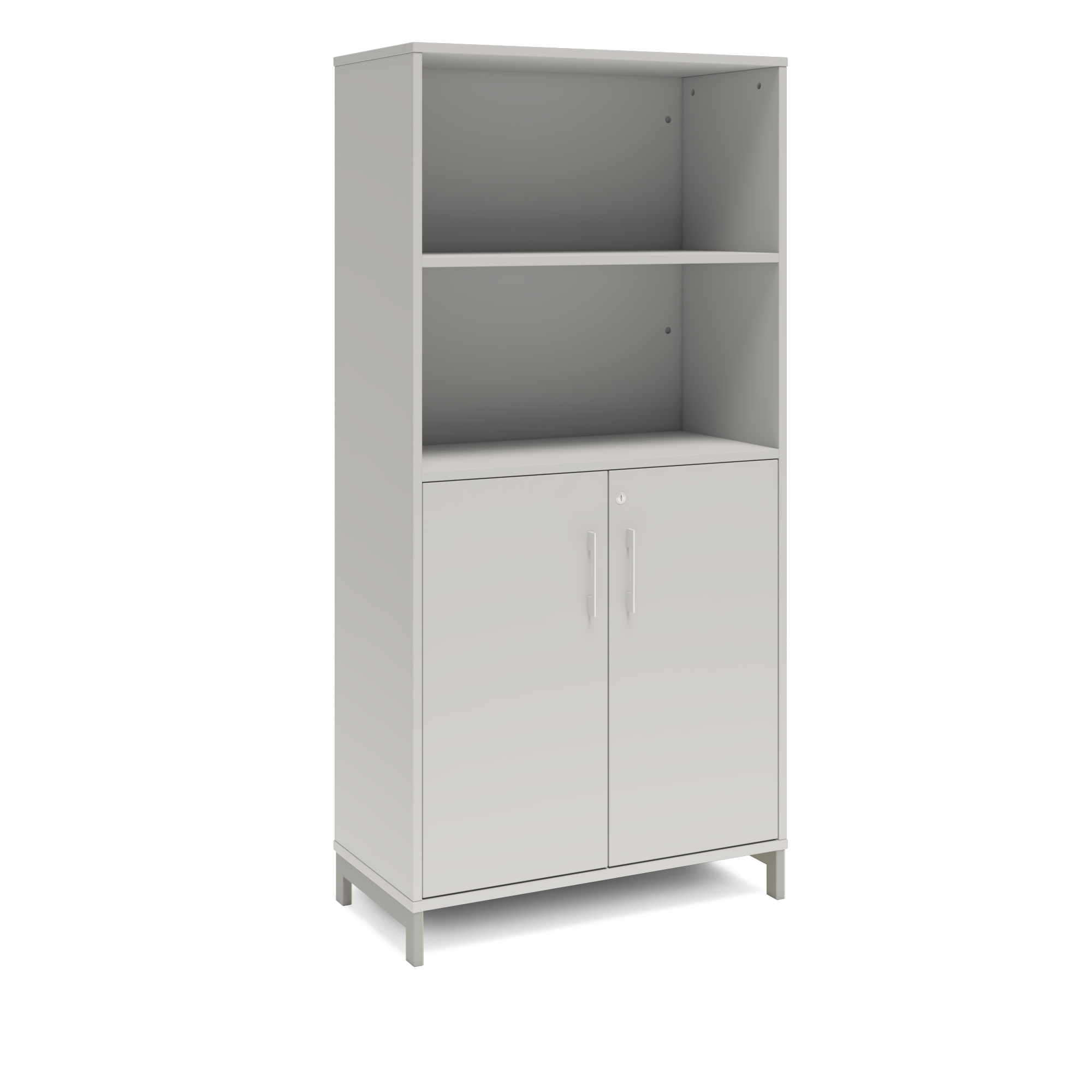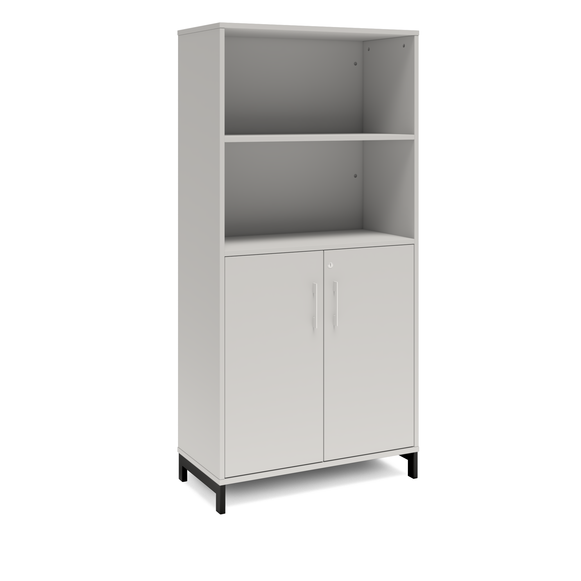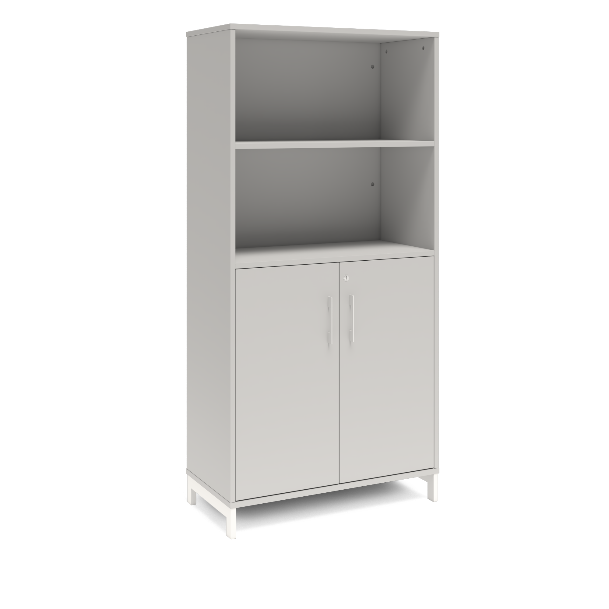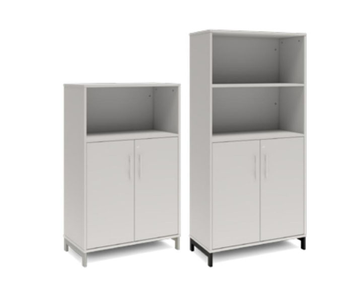 En färdigmonterad vit bokhylla med delvis dörrar för ert kontor baserat på valfrihet, utsökt design, ordentlig kvalitet och bra pris. Denna bokhylla i ljusgrå färg passar dig som vill ha ett ljust kontor., men inte för vitt. Förvaringen har delikata handtag i elgalvaniserad aluminium, ett solitt lås med fällbar nyckel. Välj stativ i tre olika färger, som lyfter upp möbeln och möjliggör en ordentlig städning. Skåpen är färdigmonterade, det enda du måste göra är att fästa stativ och montera handtag.
