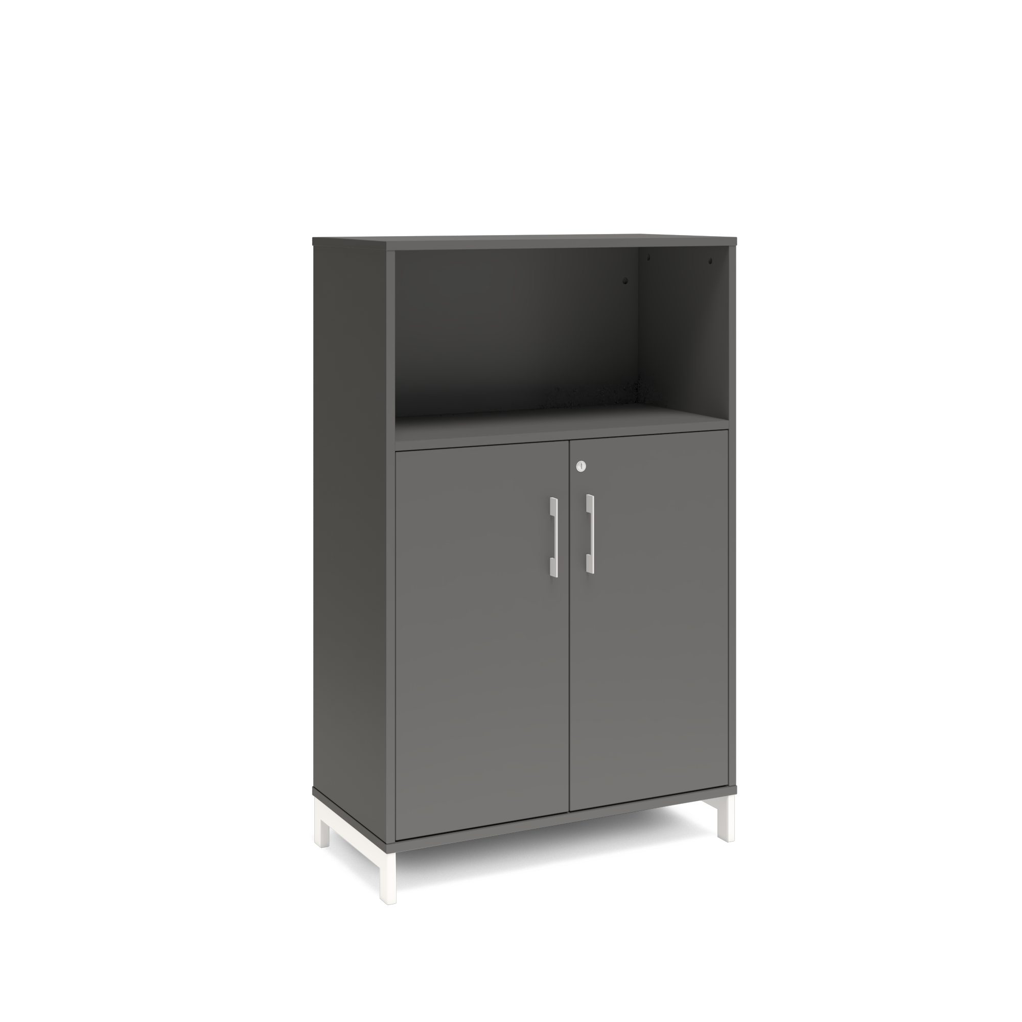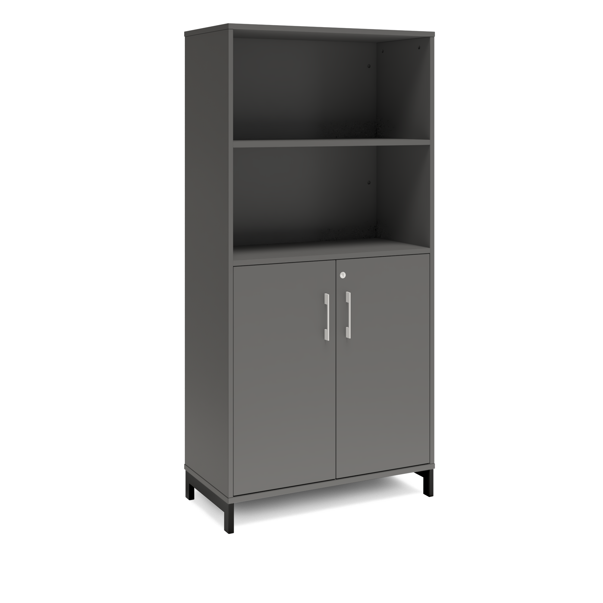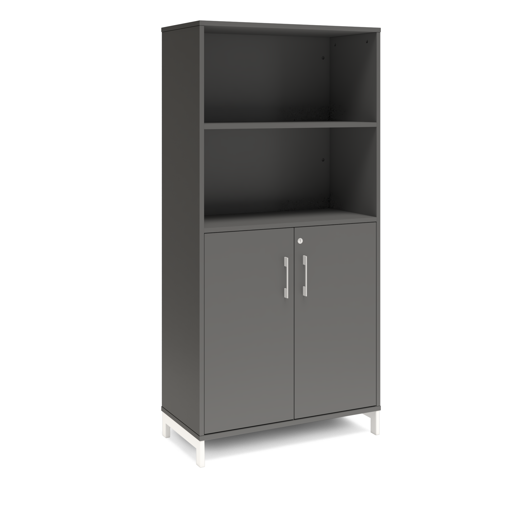 En färdigmonterad vit bokhylla med delvis dörrar för ert kontor baserat på valfrihet, utsökt design, ordentlig kvalitet och bra pris. Denna bokhylla i mörkgrå färg passar dig som vill ha mörkare möbler och skapa exklusivitet. Förvaringen har delikata handtag i elgalvaniserad aluminium, ett solitt lås med fällbar nyckel. Välj stativ i tre olika färger, som lyfter upp möbeln och möjliggör en ordentlig städning. Skåpen är färdigmonterade, det enda du måste göra är att fästa stativ och montera handtag.