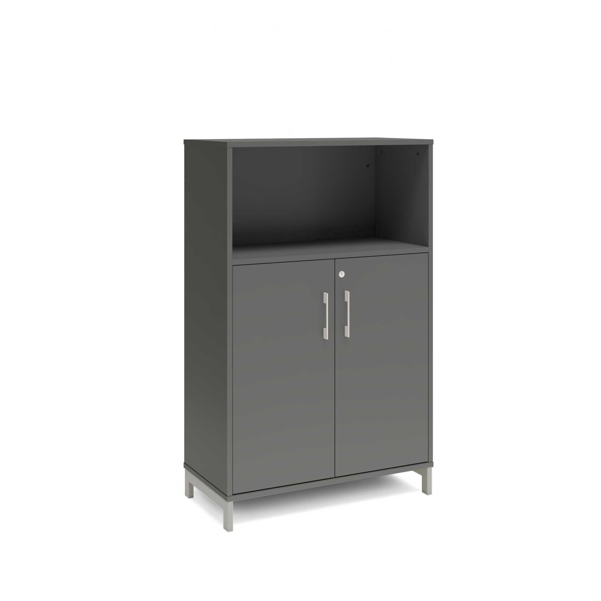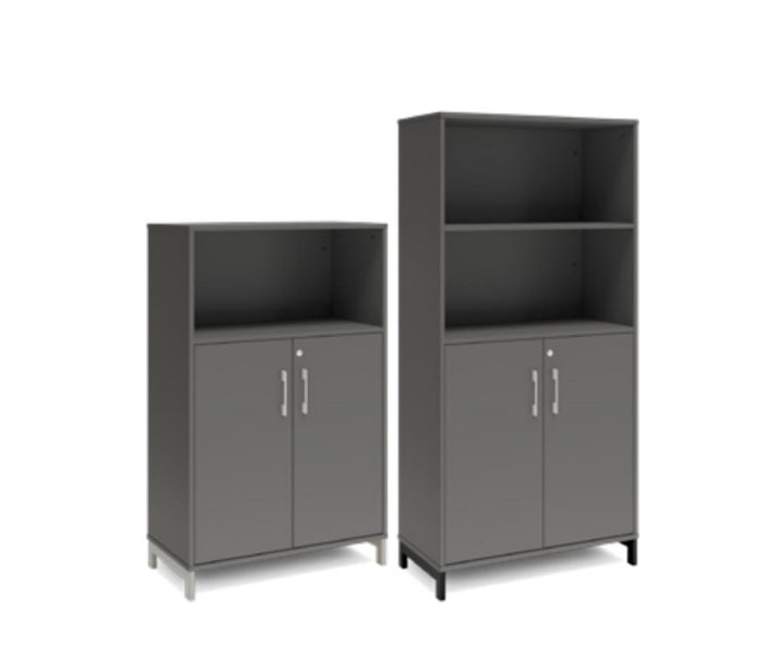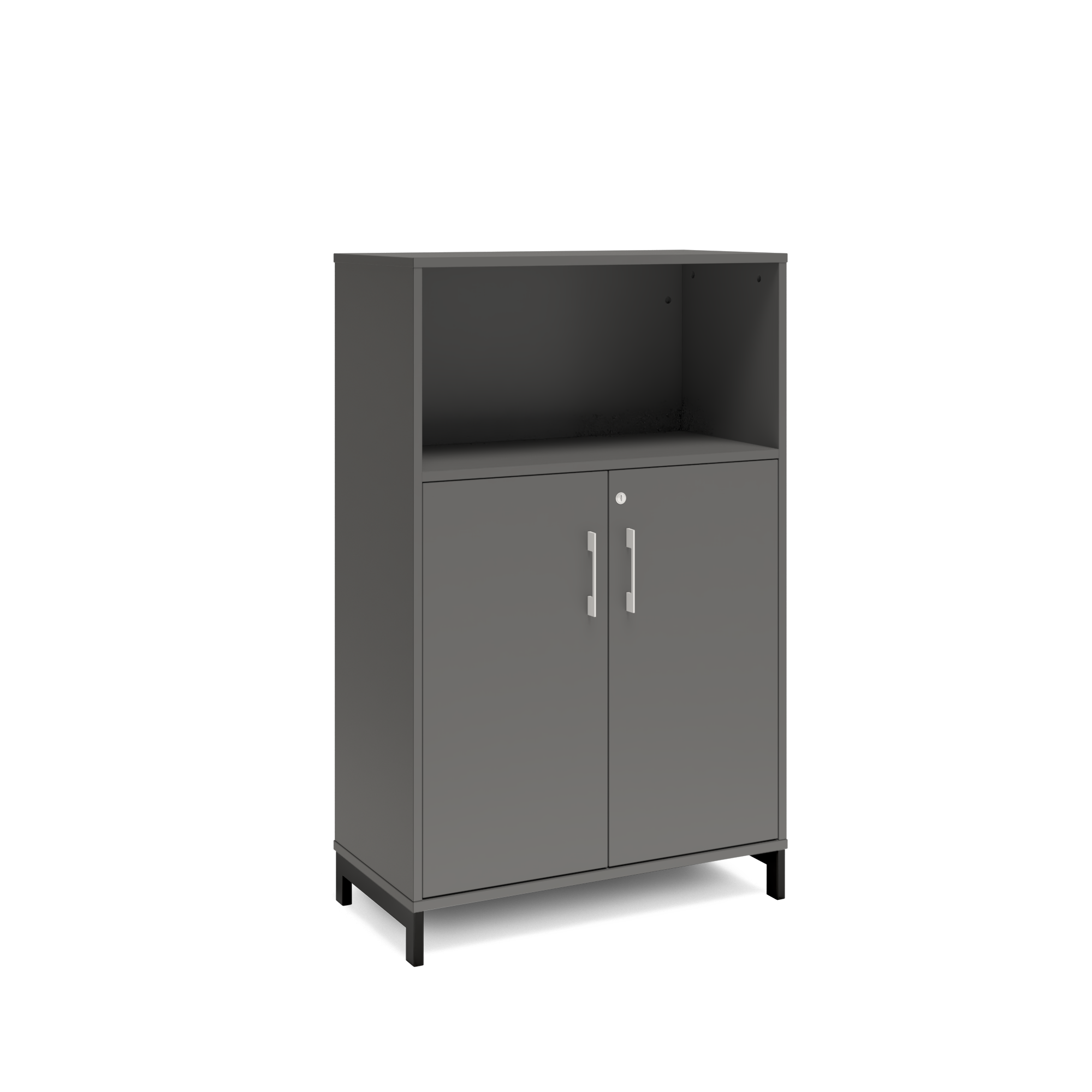 En färdigmonterad vit bokhylla med delvis dörrar för ert kontor baserat på valfrihet, utsökt design, ordentlig kvalitet och bra pris. Denna bokhylla i mörkgrå färg passar dig som vill ha mörkare möbler och skapa exklusivitet. Förvaringen har delikata handtag i elgalvaniserad aluminium, ett solitt lås med fällbar nyckel. Välj stativ i tre olika färger, som lyfter upp möbeln och möjliggör en ordentlig städning. Skåpen är färdigmonterade, det enda du måste göra är att fästa stativ och montera handtag.