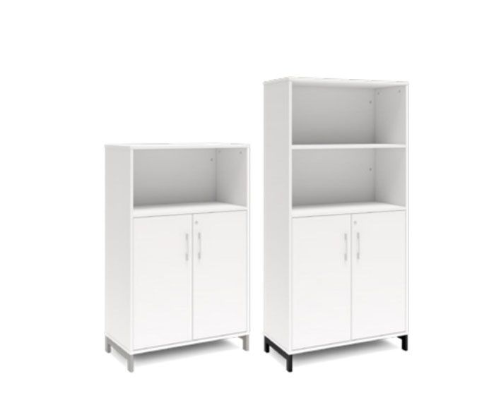En färdigmonterad vit bokhylla med delvis dörrar för ert kontor baserat på valfrihet, utsökt design, ordentlig kvalitet och bra pris. Denna bokhylla i vit färg passar dig som vill ha ett ljust kontor. Förvaringen har delikata handtag i elgalvaniserad aluminium, ett solitt lås med fällbar nyckel. Välj stativ i tre olika färger, som lyfter upp möbeln och möjliggör en ordentlig städning. Skåpen är färdigmonterade, det enda du måste göra är att fästa stativ och montera handtag.