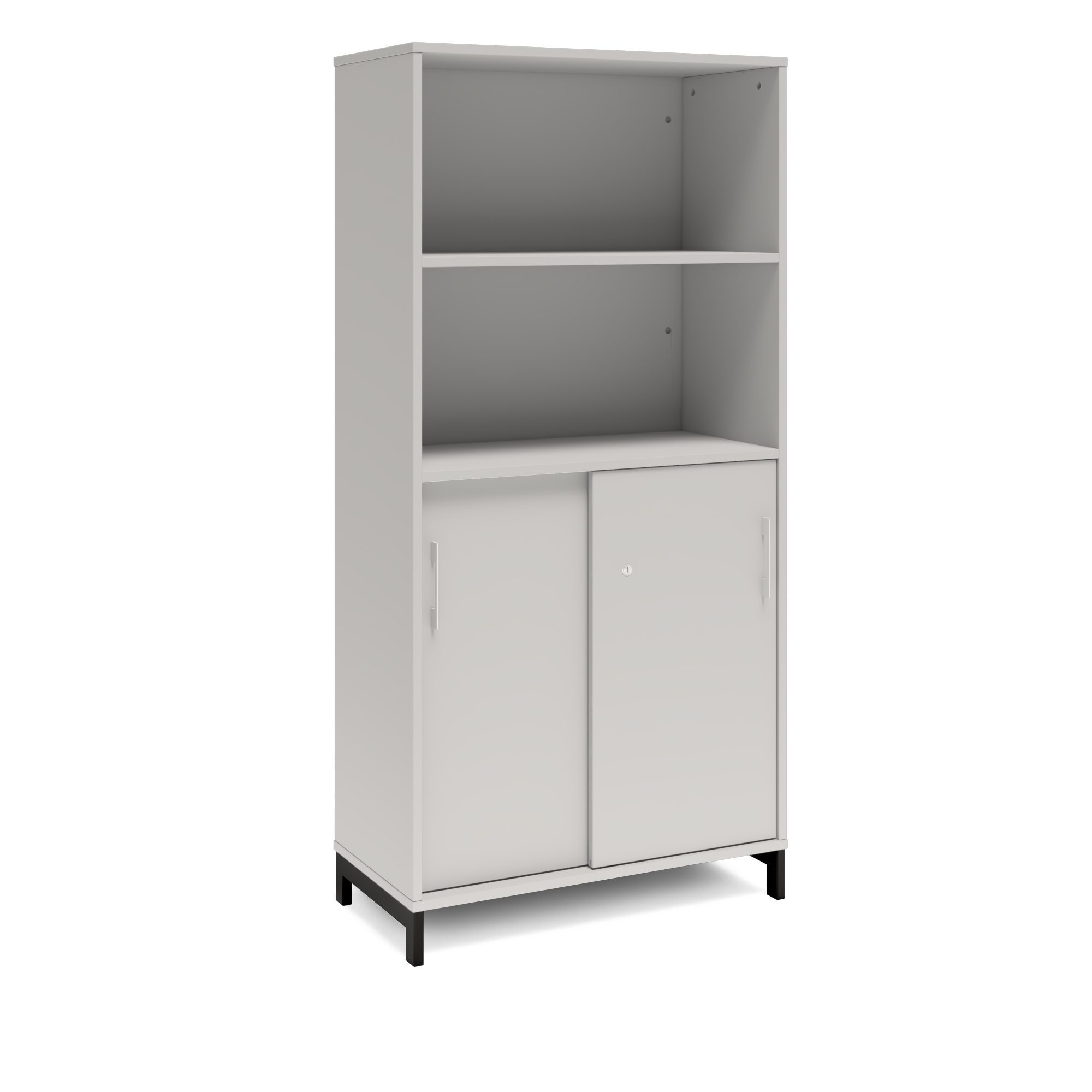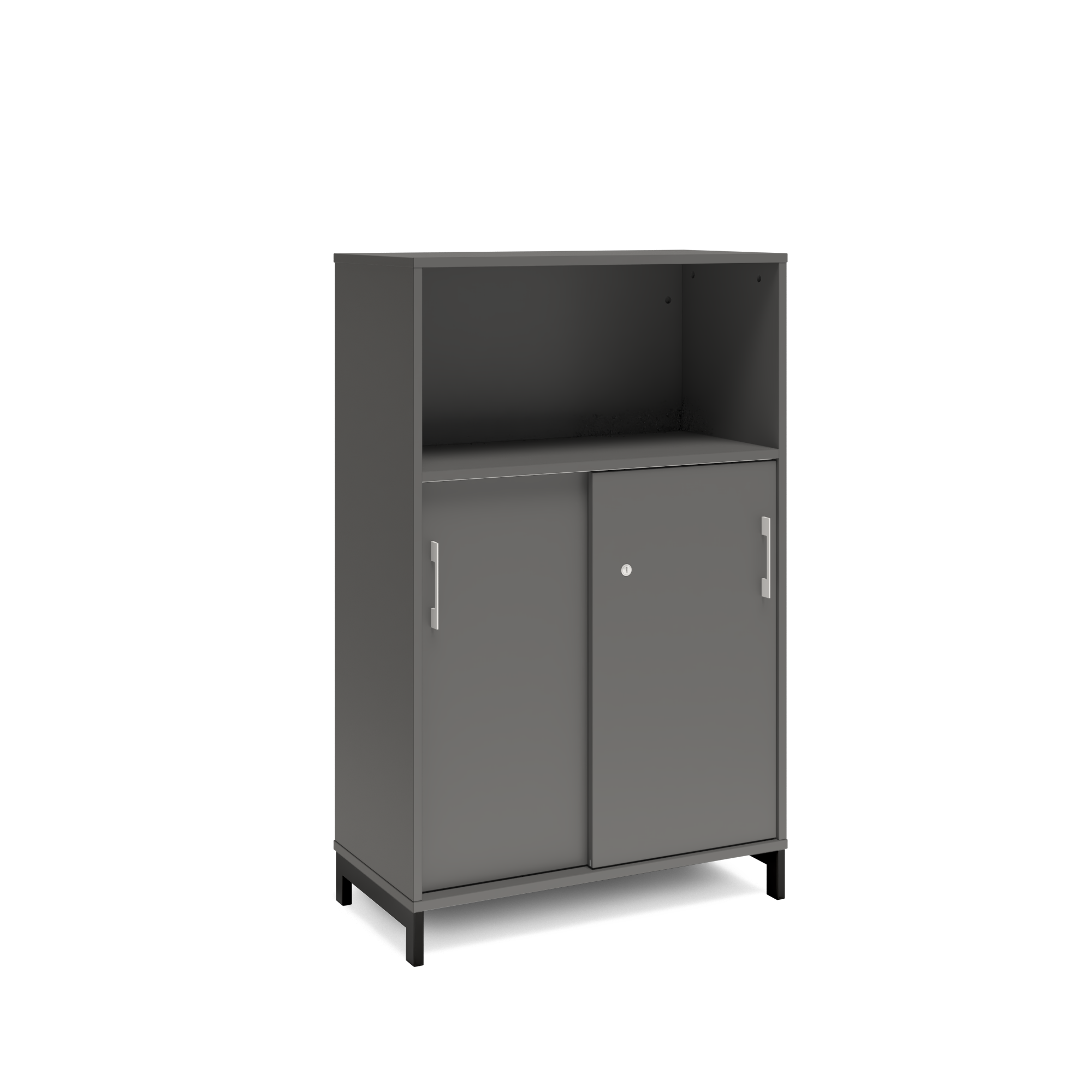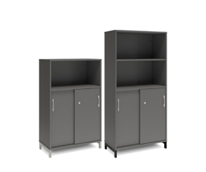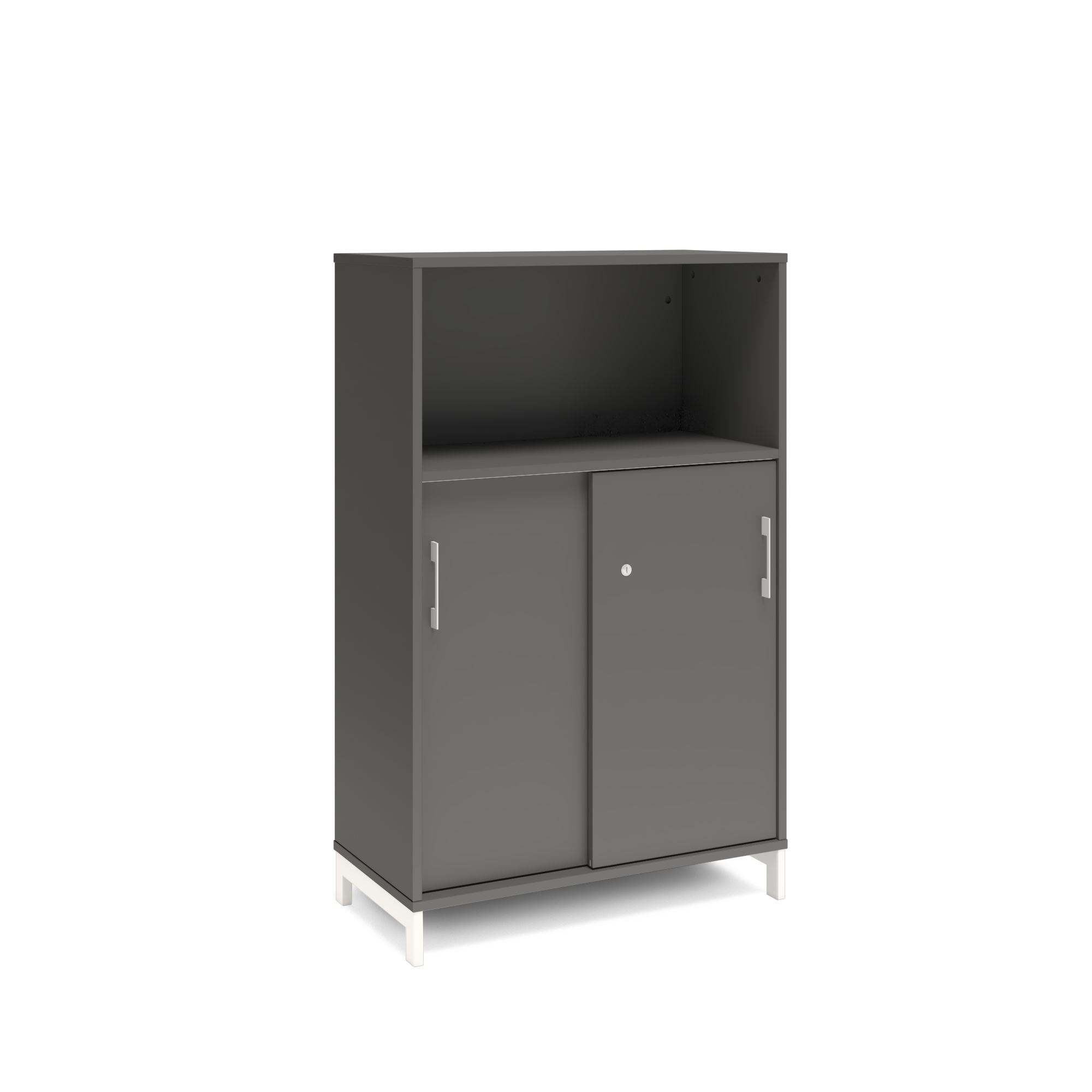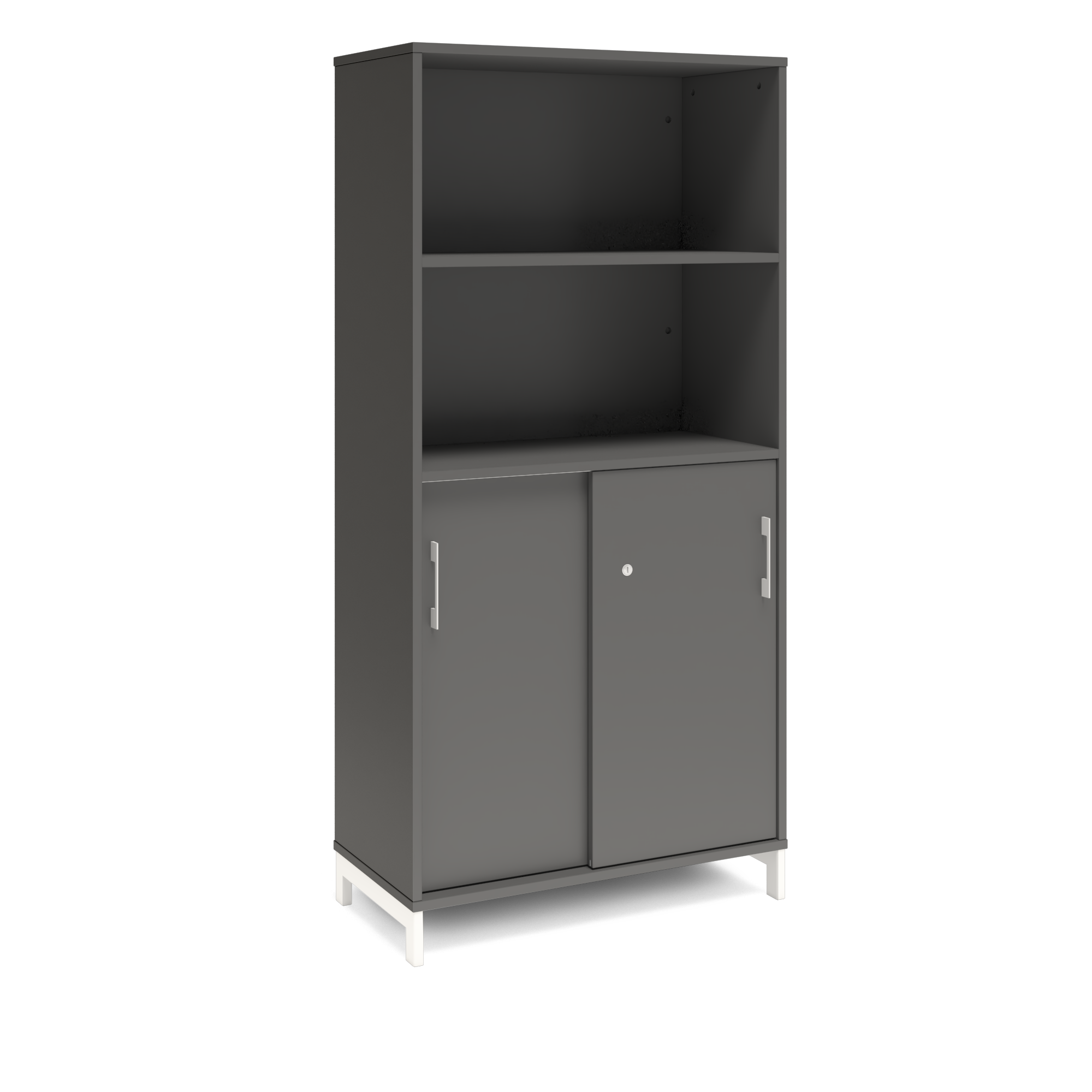 En färdigmonterad vit bokhylla med delvis skjutdörrar för ert kontor baserat på valfrihet, utsökt design, ordentlig kvalitet och bra pris. Denna bokhylla i mörkgrå färg passar dig som vill ha mörkare möbler och skapa exklusivitet. Förvaringen har delikata handtag i elgalvaniserad aluminium, ett solitt lås med fällbar nyckel. Välj stativ i tre olika färger, som lyfter upp möbeln och möjliggör en ordentlig städning. Skåpen är färdigmonterade, det enda du måste göra är att fästa stativ och montera handtag.