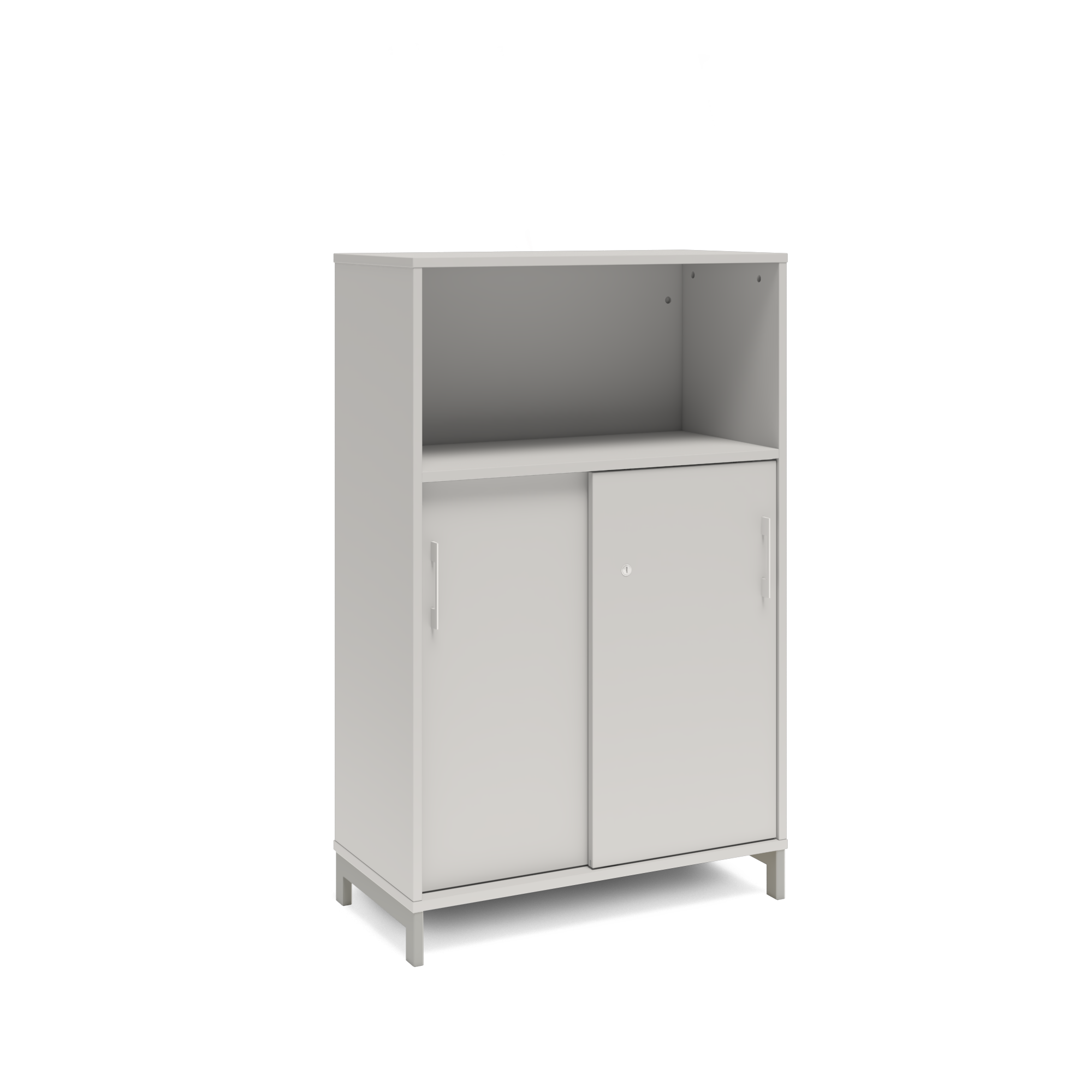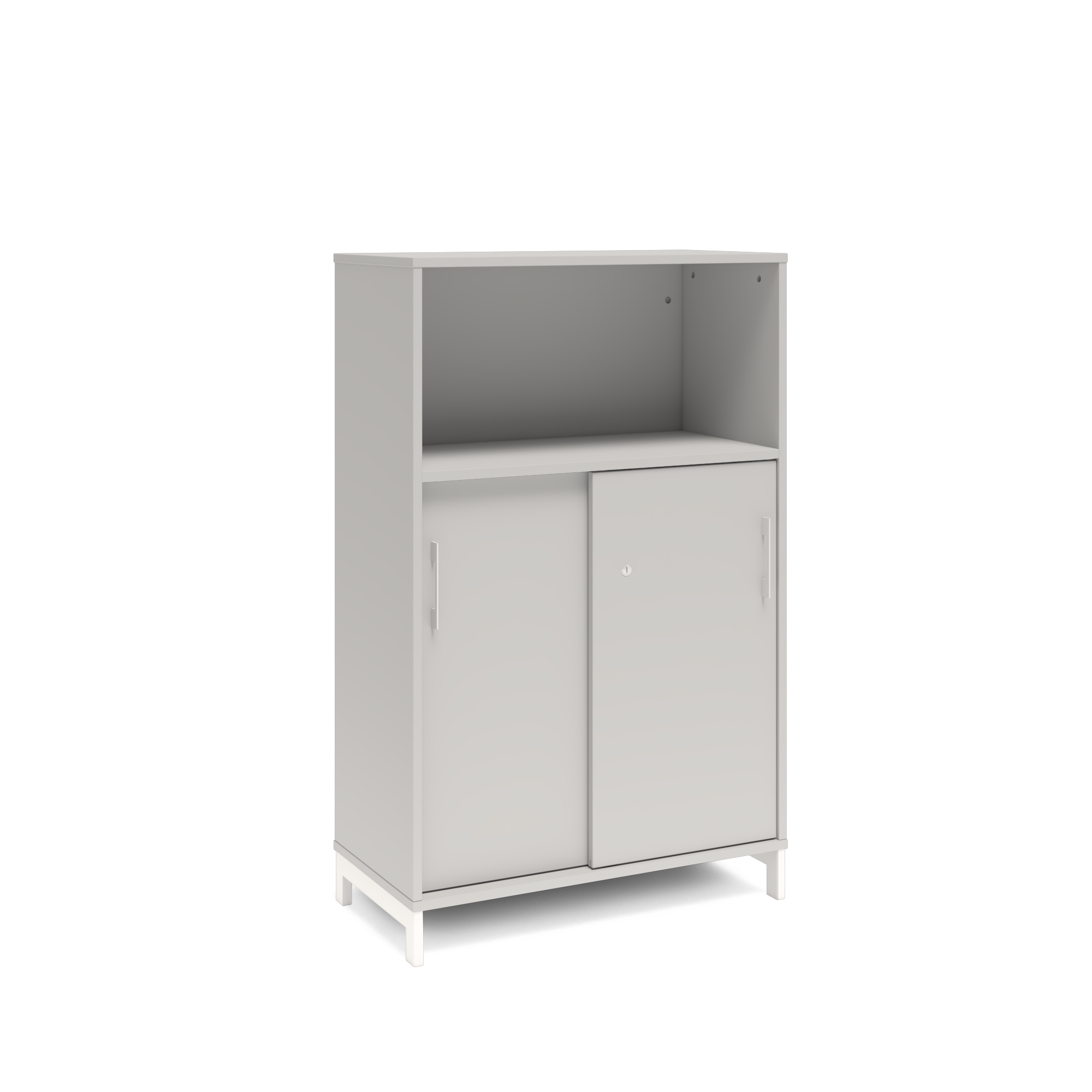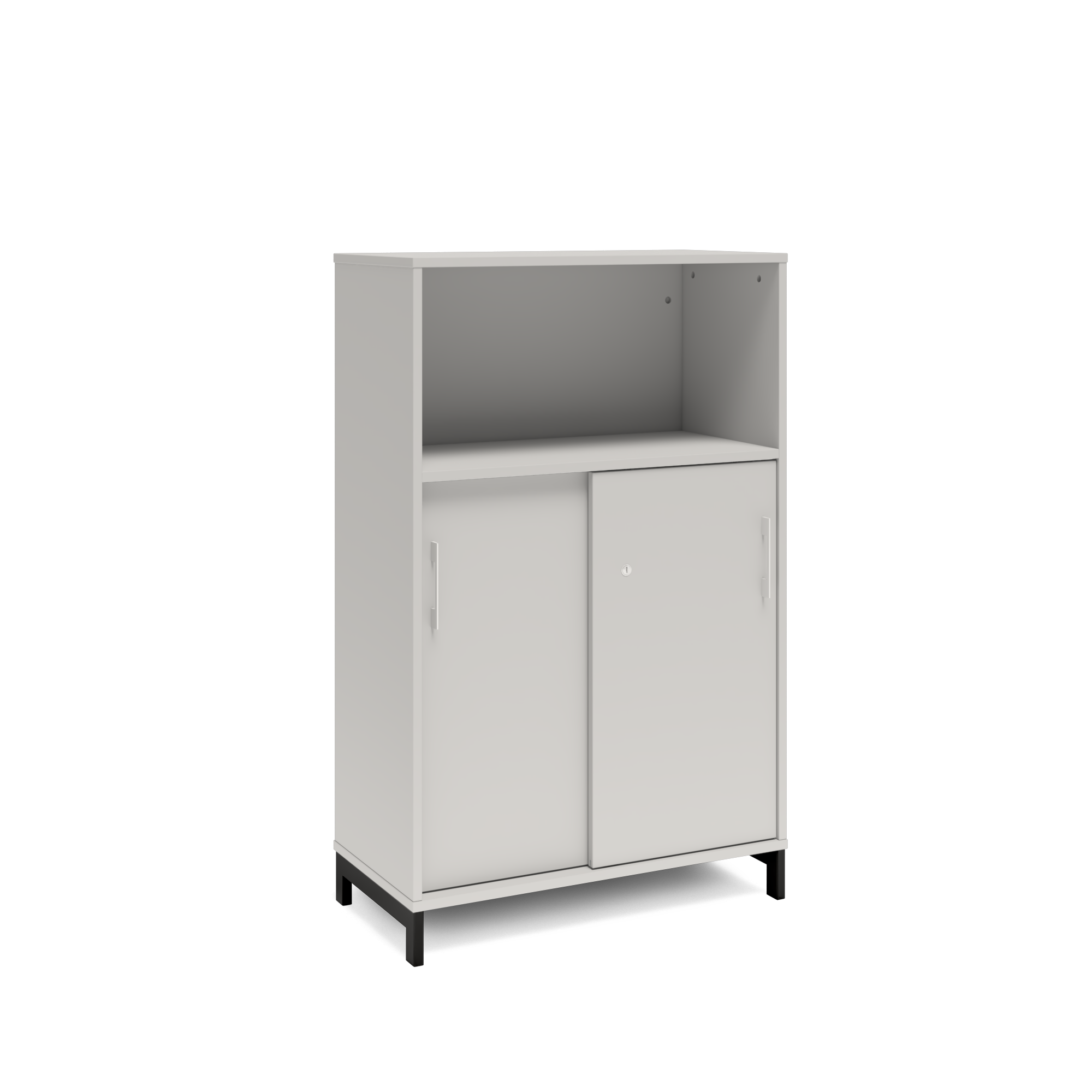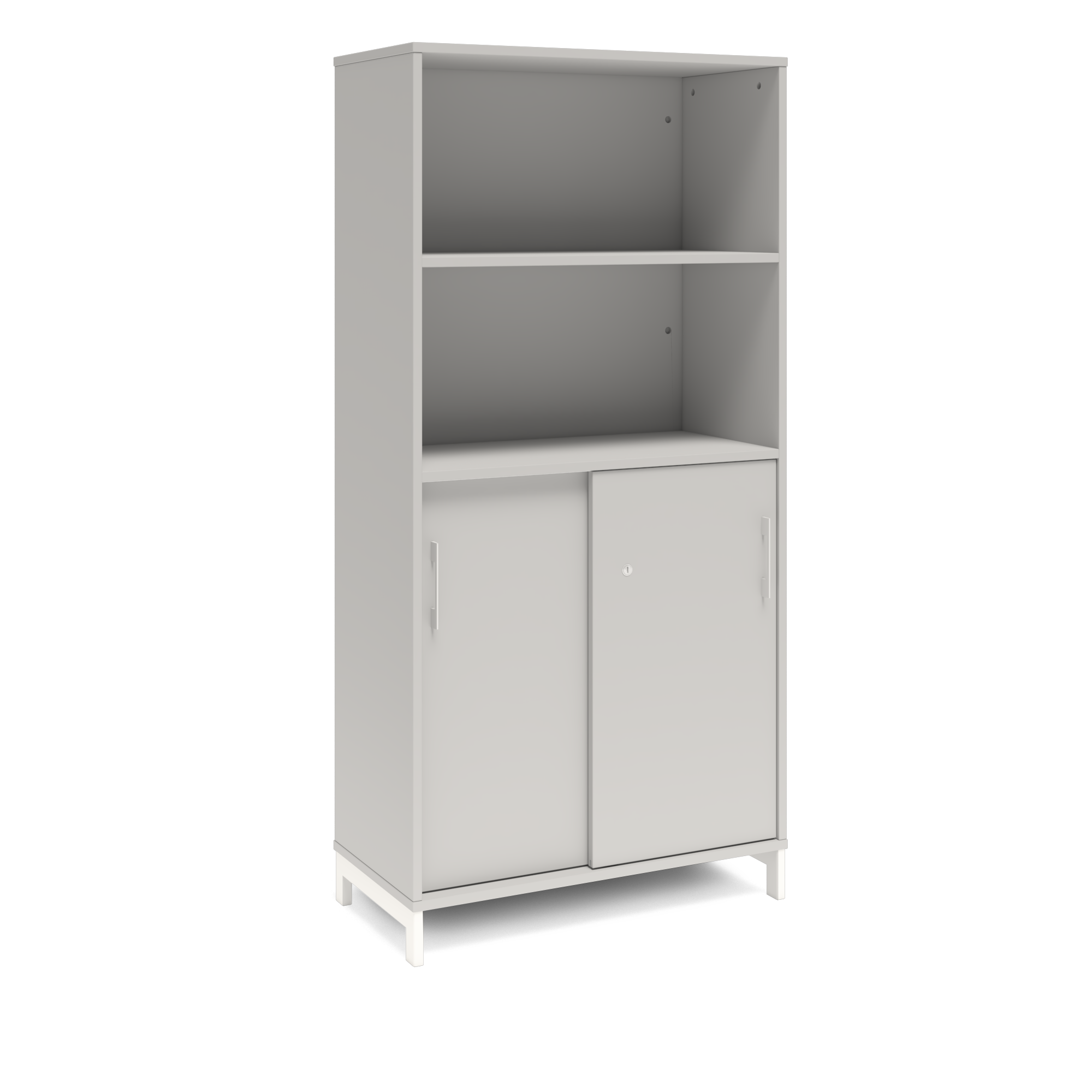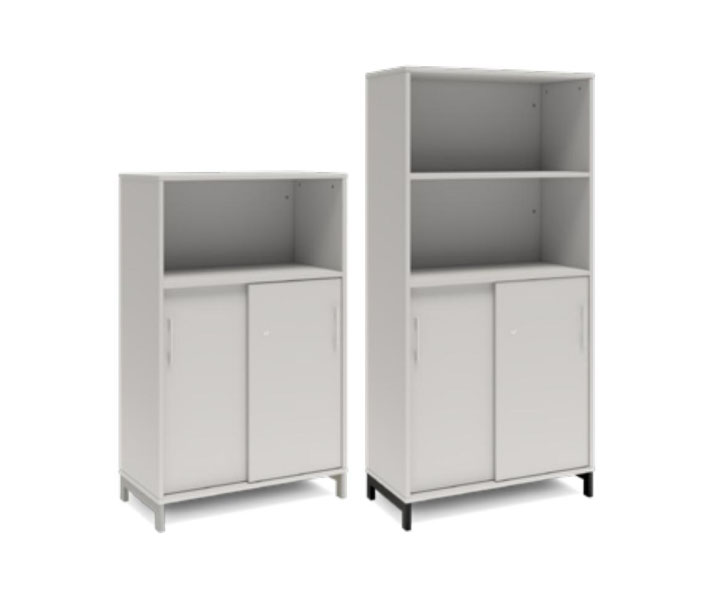 En färdigmonterad vit bokhylla med delvis skjutdörrar för ert kontor baserat på valfrihet, utsökt design, ordentlig kvalitet och bra pris. Denna bokhylla i mörkgrå färg passar dig som vill ha mörkare möbler och skapa exklusivitet. Förvaringen har delikata handtag i elgalvaniserad aluminium, ett solitt lås med fällbar nyckel. Välj stativ i tre olika färger, som lyfter upp möbeln och möjliggör en ordentlig städning. Skåpen är färdigmonterade, det enda du måste göra är att fästa stativ och montera handtag.