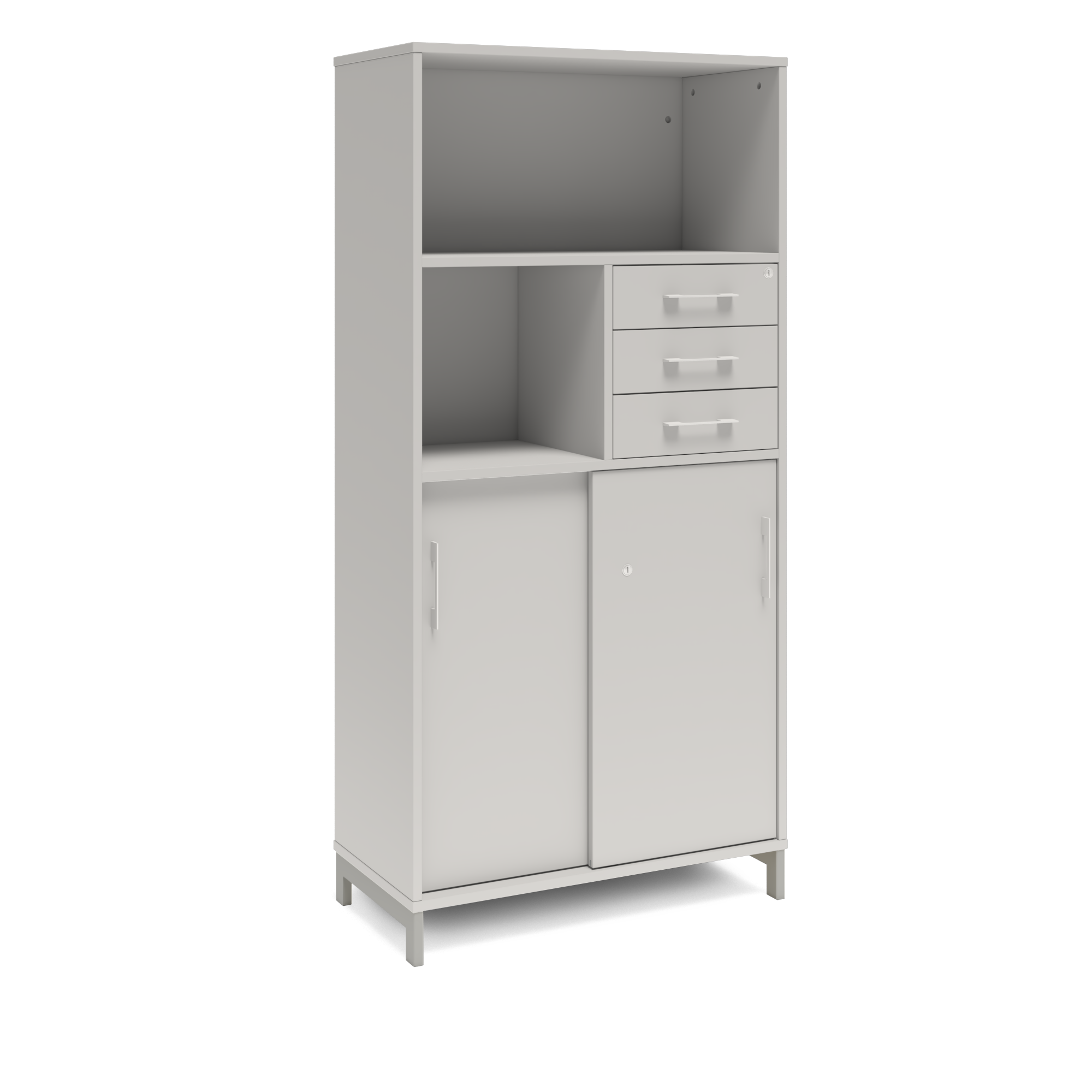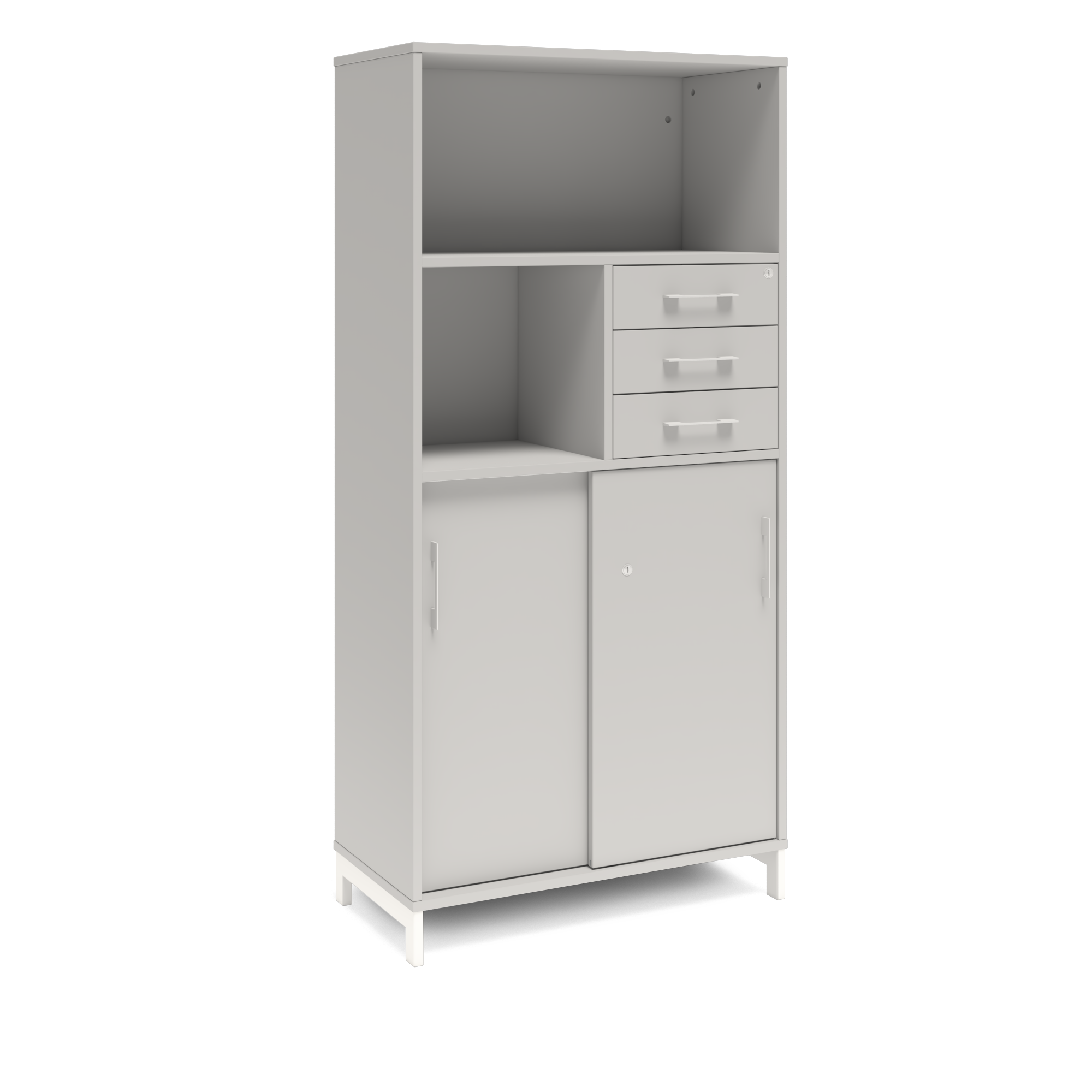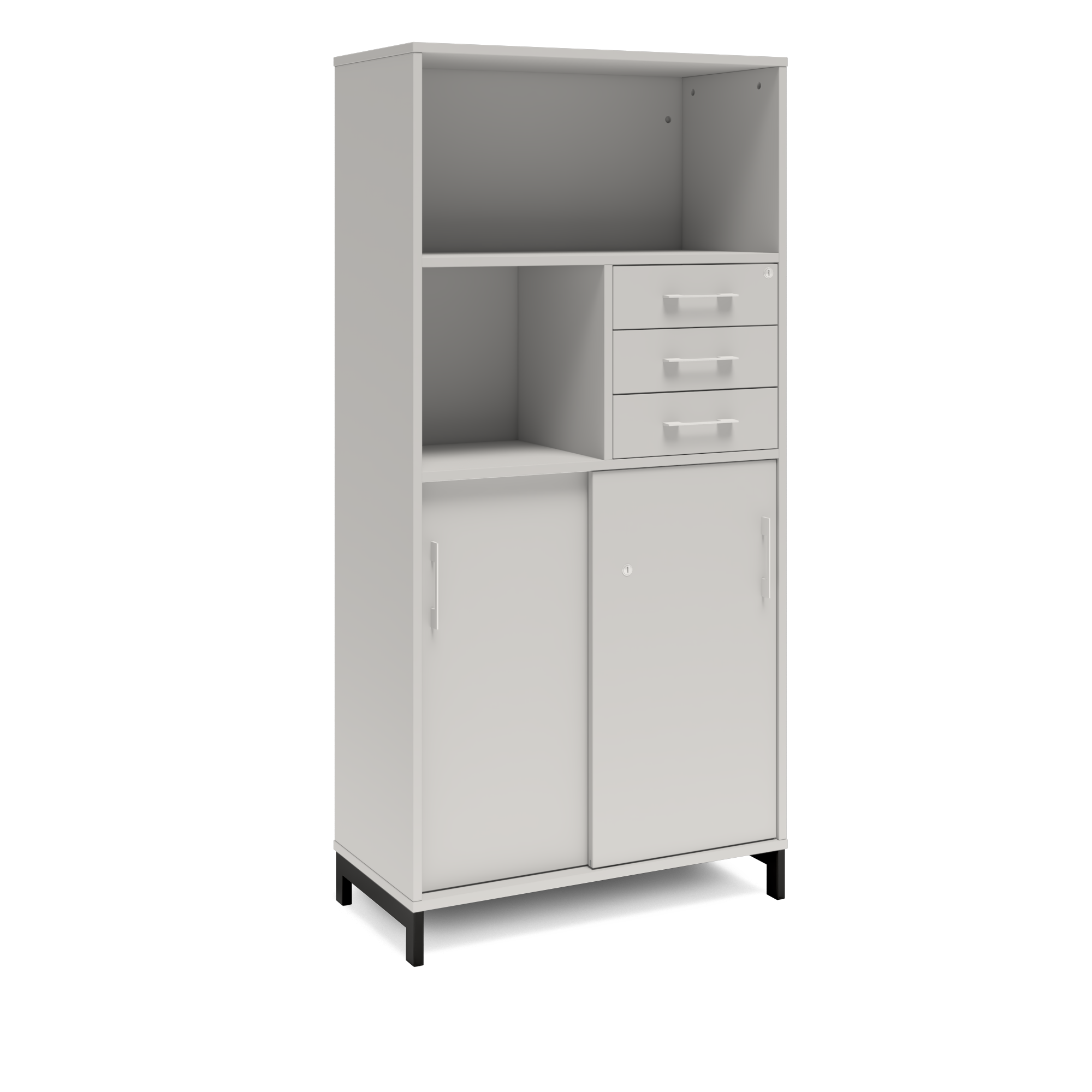 En färdigmonterad vit bokhylla med delvis skjutdörrar och lådor för ert kontor baserat på valfrihet, utsökt design, ordentlig kvalitet och bra pris. Denna bokhylla i ljusgrå färg passar dig som vill ha ett ljust kontor, men inte för vitt. Förvaringen har delikata handtag i elgalvaniserad aluminium, ett solitt lås med fällbar nyckel. Välj stativ i tre olika färger, som lyfter upp möbeln och möjliggör en ordentlig städning. Skåpen är färdigmonterade, det enda du måste göra är att fästa stativ och montera handtag.