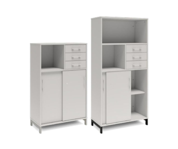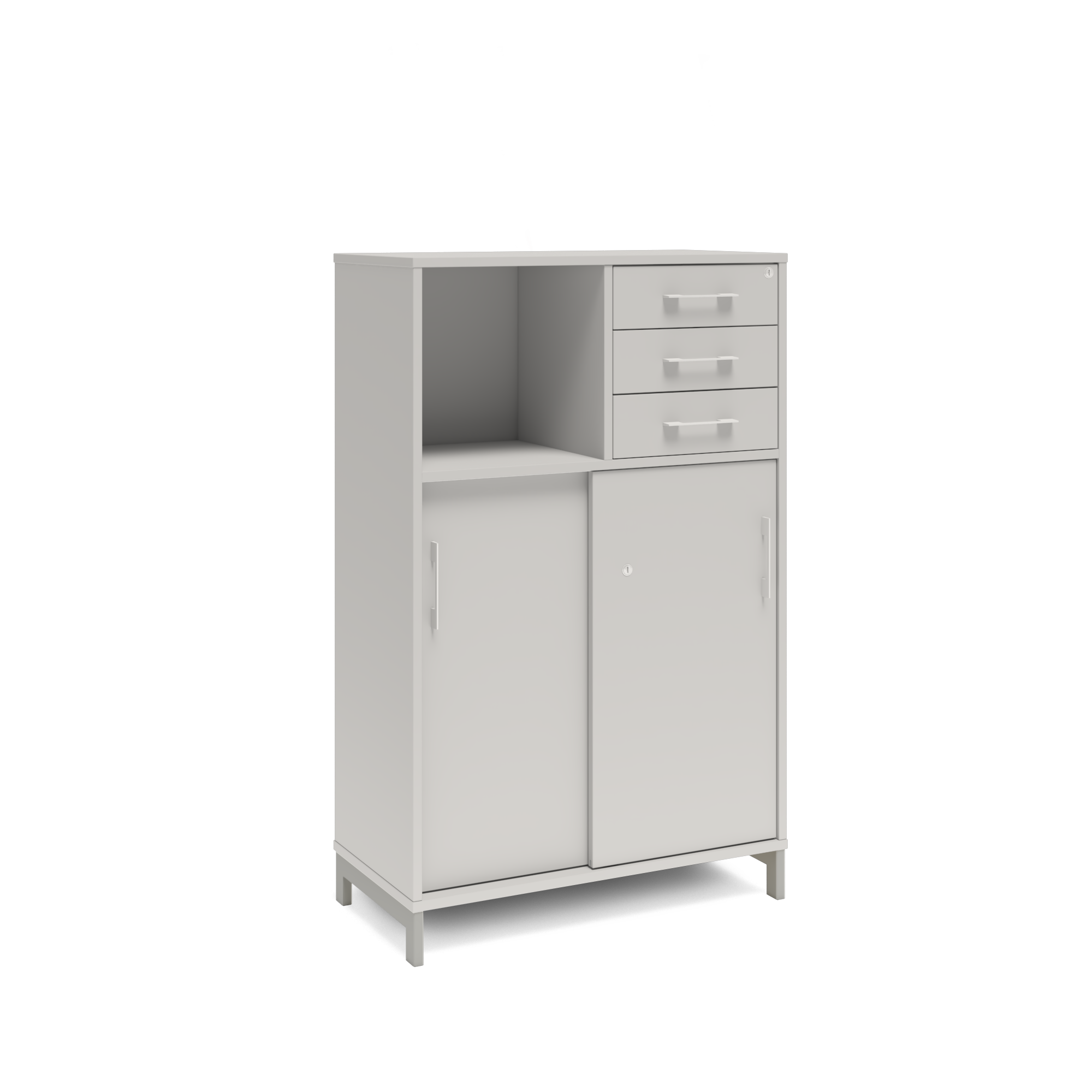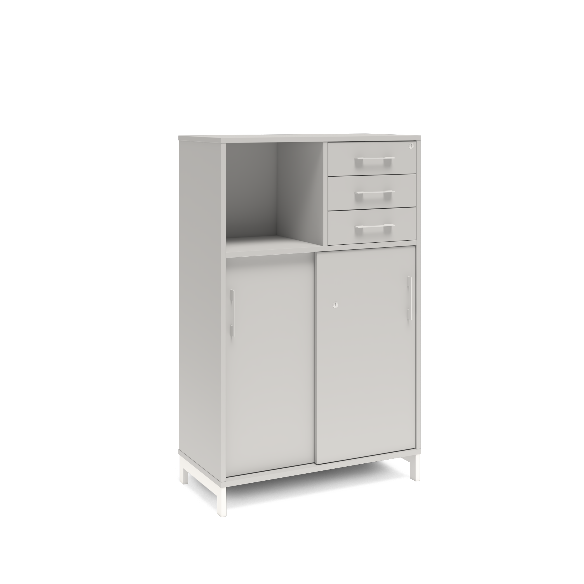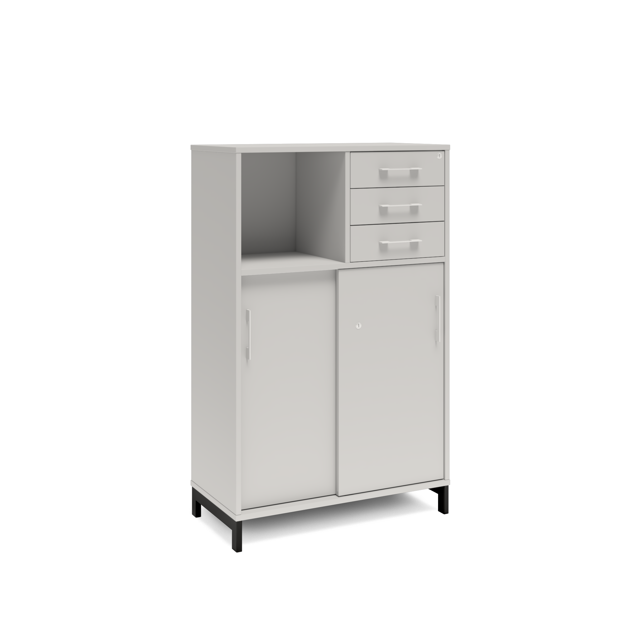 En färdigmonterad vit bokhylla med delvis skjutdörrar och lådor för ert kontor baserat på valfrihet, utsökt design, ordentlig kvalitet och bra pris. Denna bokhylla i ljusgrå färg passar dig som vill ha ett ljust kontor, men inte för vitt. Förvaringen har delikata handtag i elgalvaniserad aluminium, ett solitt lås med fällbar nyckel. Välj stativ i tre olika färger, som lyfter upp möbeln och möjliggör en ordentlig städning. Skåpen är färdigmonterade, det enda du måste göra är att fästa stativ och montera handtag.