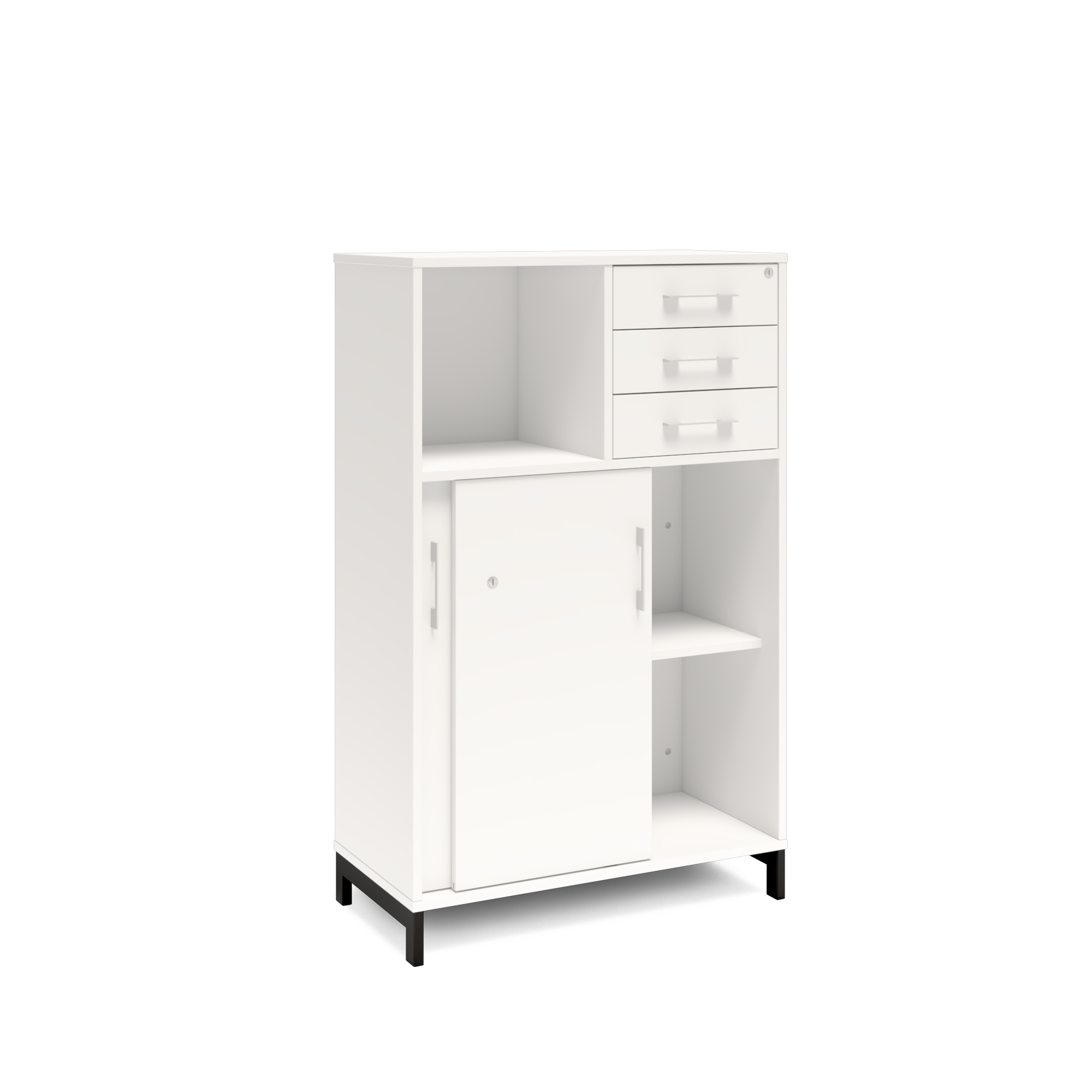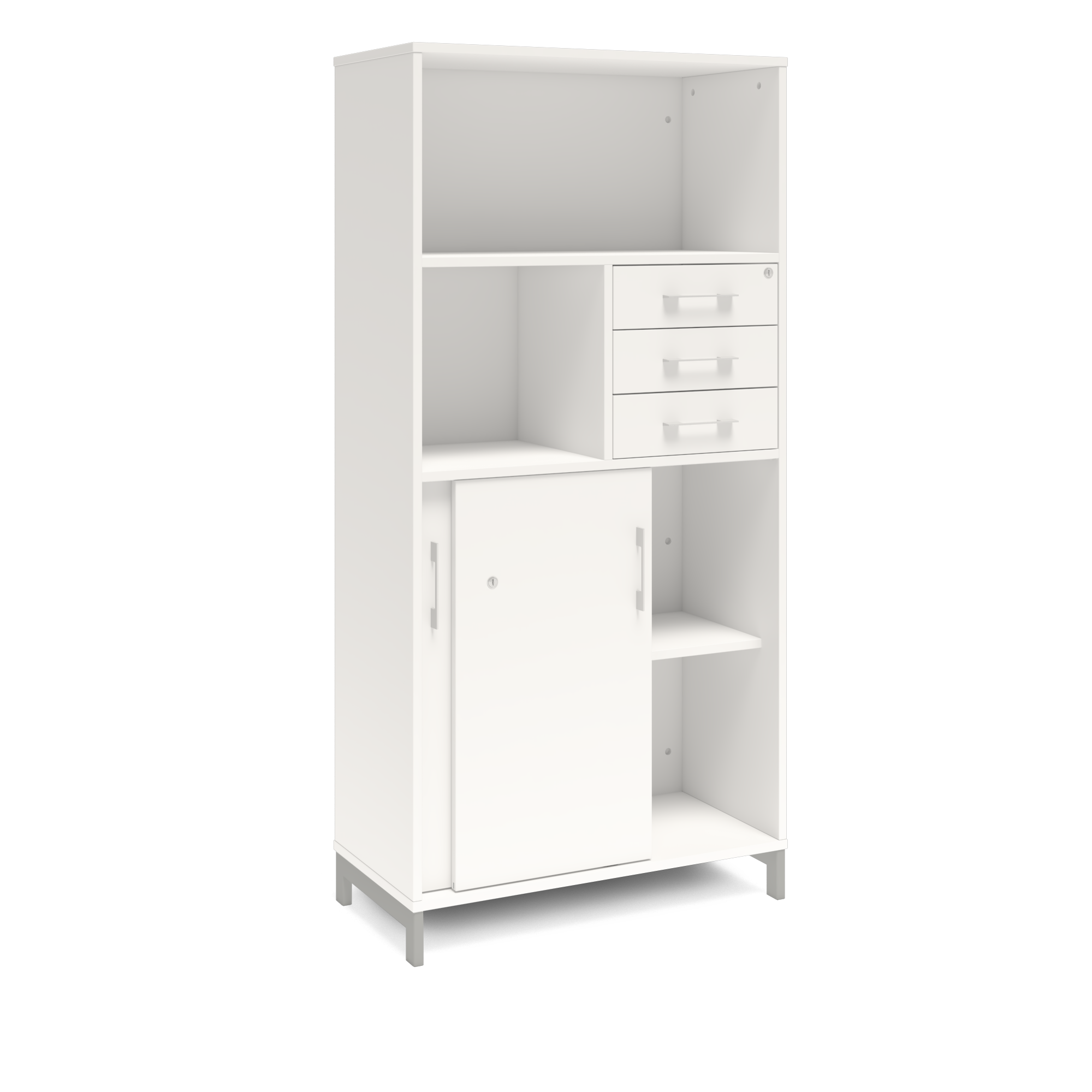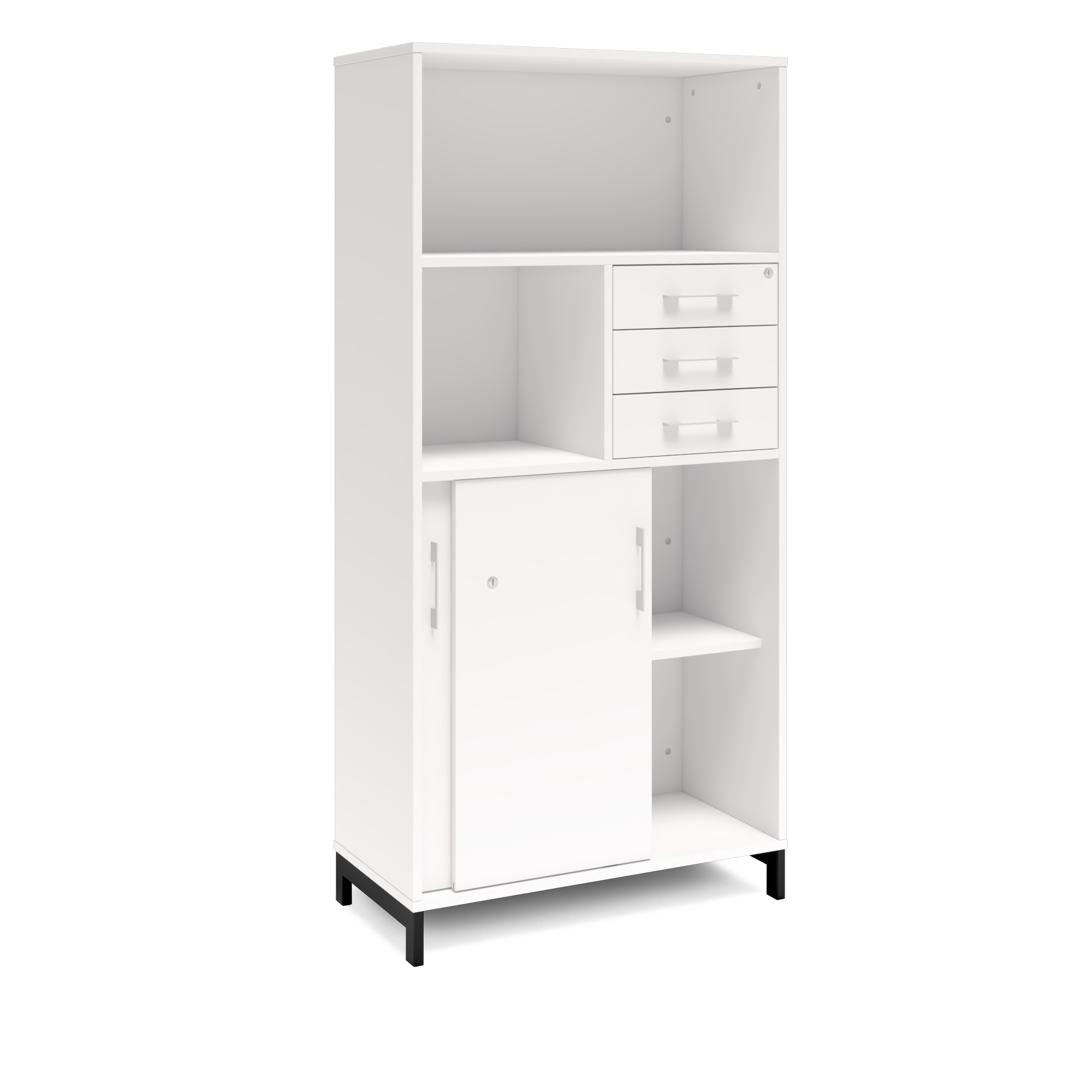 En färdigmonterad vit bokhylla med delvis skjutdörrar och lådor för ert kontor baserat på valfrihet, utsökt design, ordentlig kvalitet och bra pris. Denna bokhylla i vit färg passar dig som vill ha ett ljust kontor. Förvaringen har delikata handtag i elgalvaniserad aluminium, ett solitt lås med fällbar nyckel. Välj stativ i tre olika färger, som lyfter upp möbeln och möjliggör en ordentlig städning. Skåpen är färdigmonterade, det enda du måste göra är att fästa stativ och montera handtag.