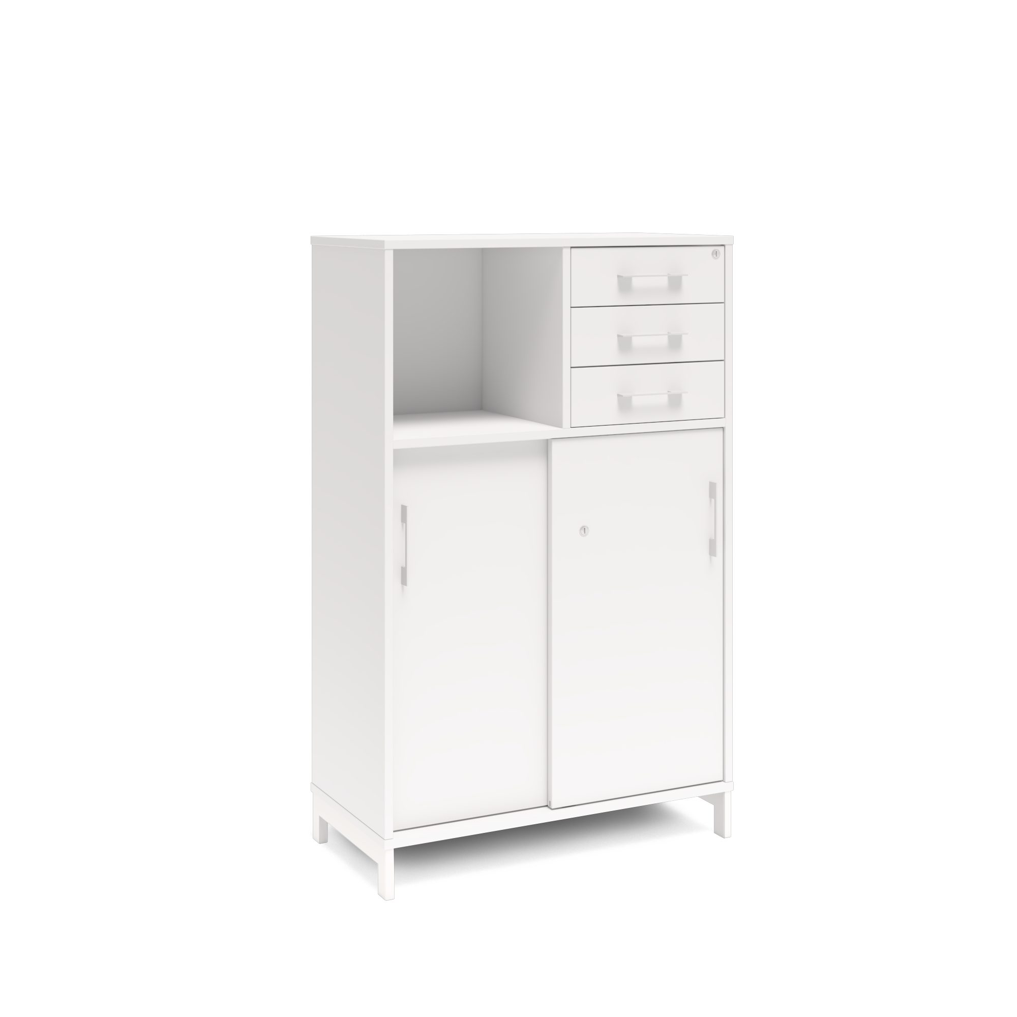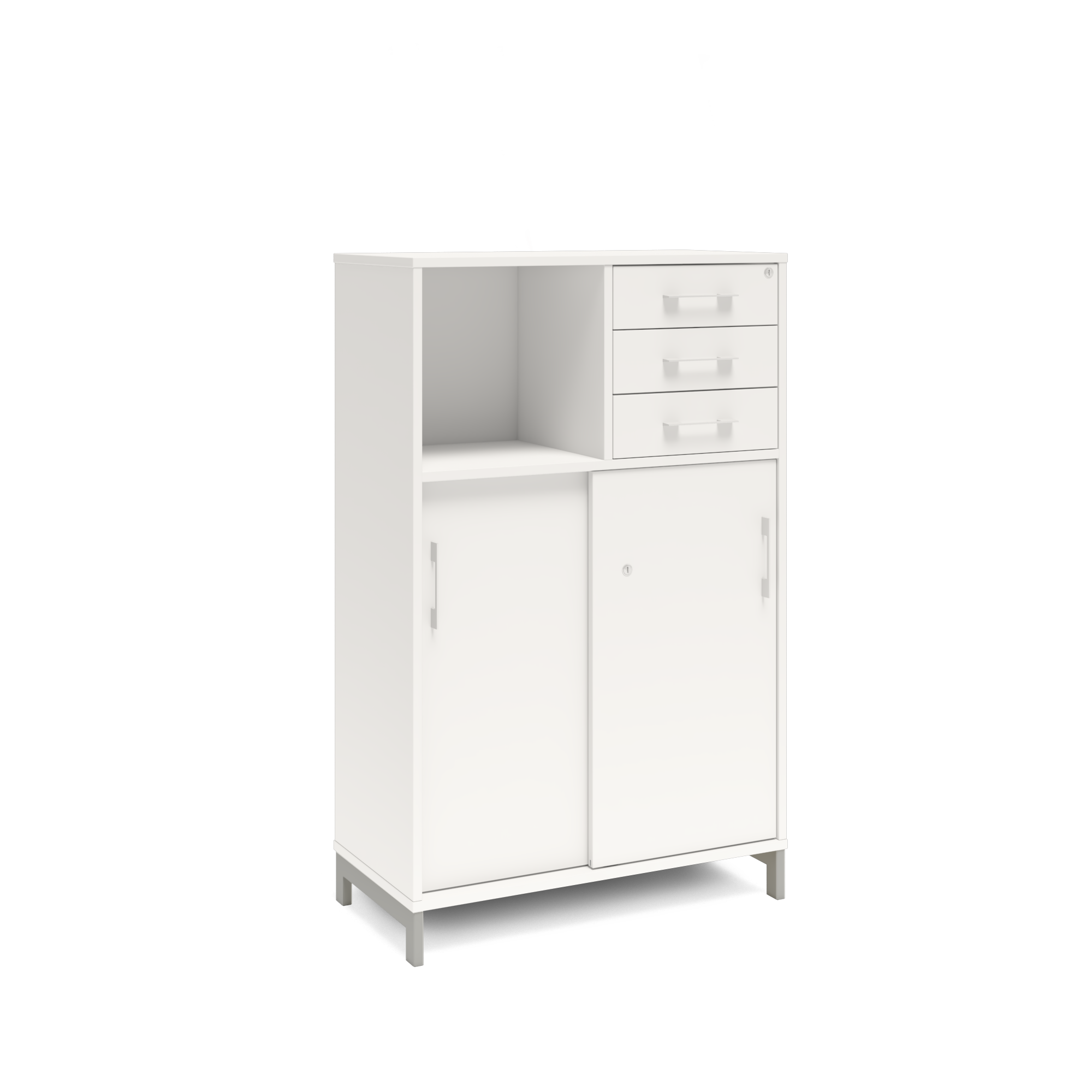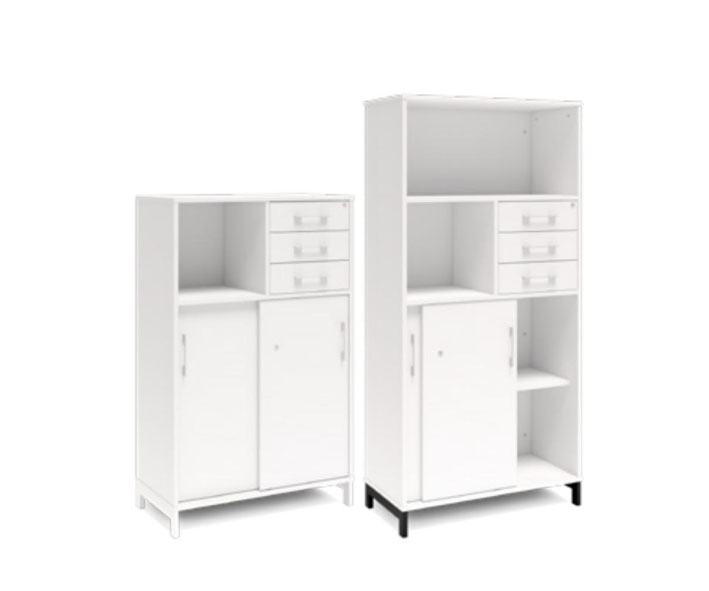 En färdigmonterad vit bokhylla med delvis skjutdörrar och lådor för ert kontor baserat på valfrihet, utsökt design, ordentlig kvalitet och bra pris. Denna bokhylla i vit färg passar dig som vill ha ett ljust kontor. Förvaringen har delikata handtag i elgalvaniserad aluminium, ett solitt lås med fällbar nyckel. Välj stativ i tre olika färger, som lyfter upp möbeln och möjliggör en ordentlig städning. Skåpen är färdigmonterade, det enda du måste göra är att fästa stativ och montera handtag.