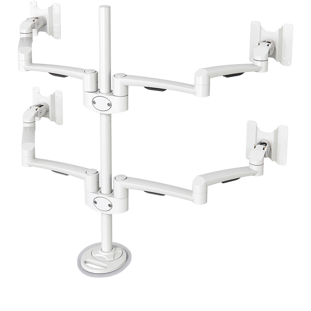 Köp denna stilrena och väldigt robusta monitorarm för 4 bildskärmar för montage med genomföringsfäste på bordsskiva.