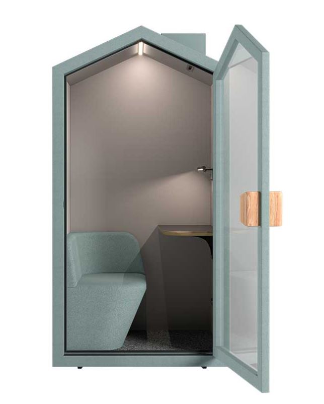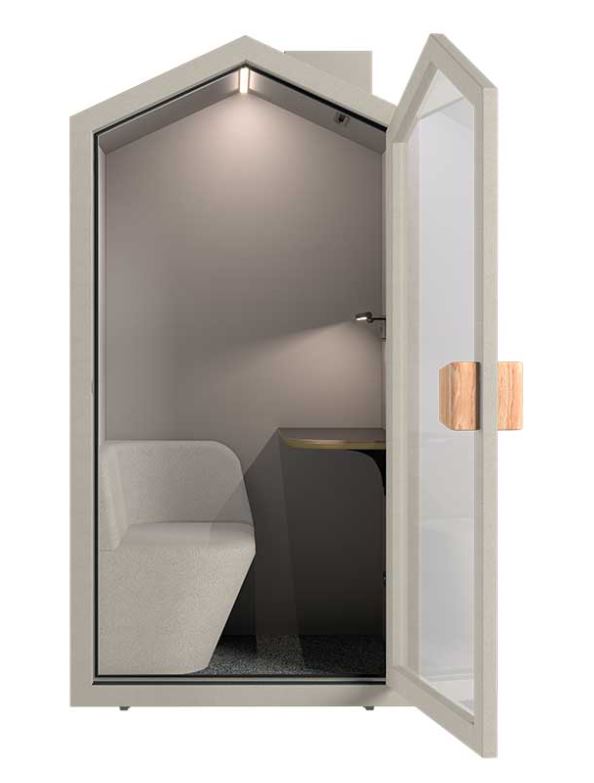 Båset är utrustat med en inbyggd soffa och bord, eluttag, USB-A och USB-C, samt rörelsesensor och transporthjul för enkel placering i kontoret. Lillstugan levereras med 5 års garanti och finns i tre noggrant utvalda färger: Oliv, Ash och Sand.