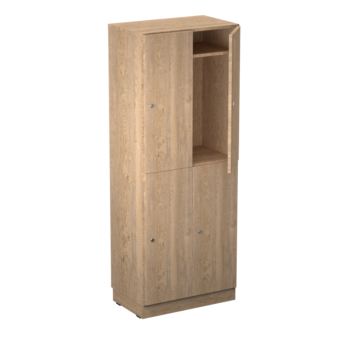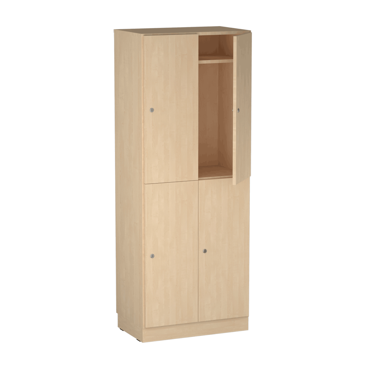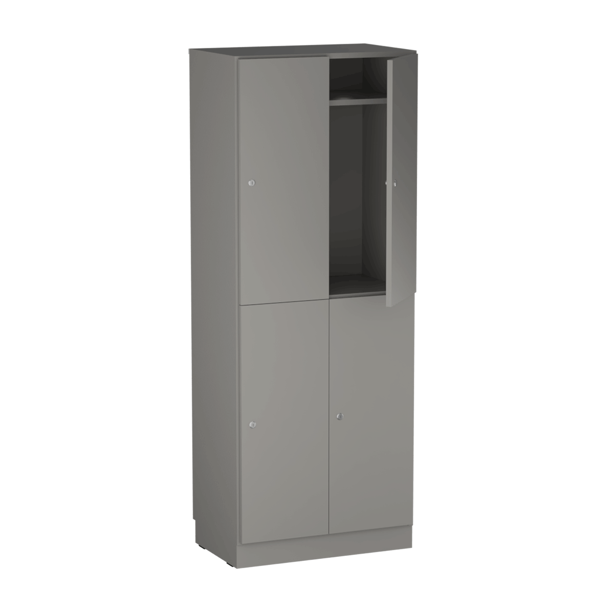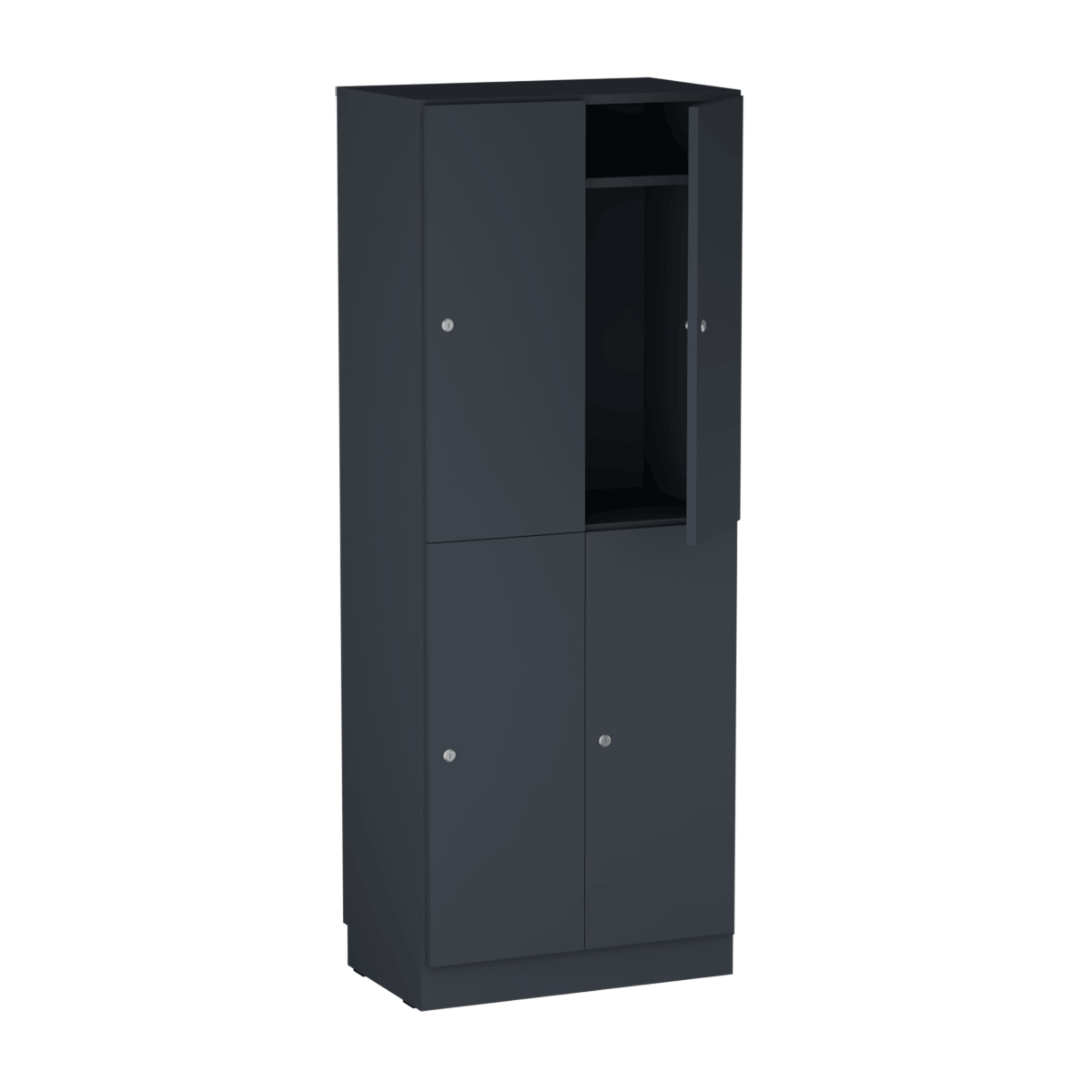 Personalskåpet är utrustat med fyra separata fack som ger gott om plats för personliga tillhörigheter, arbetsmaterial, väskor eller skolböcker. Varje användare får ett eget låsbart utrymme för trygg och organiserad förvaring.