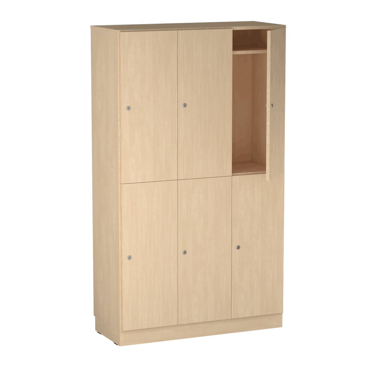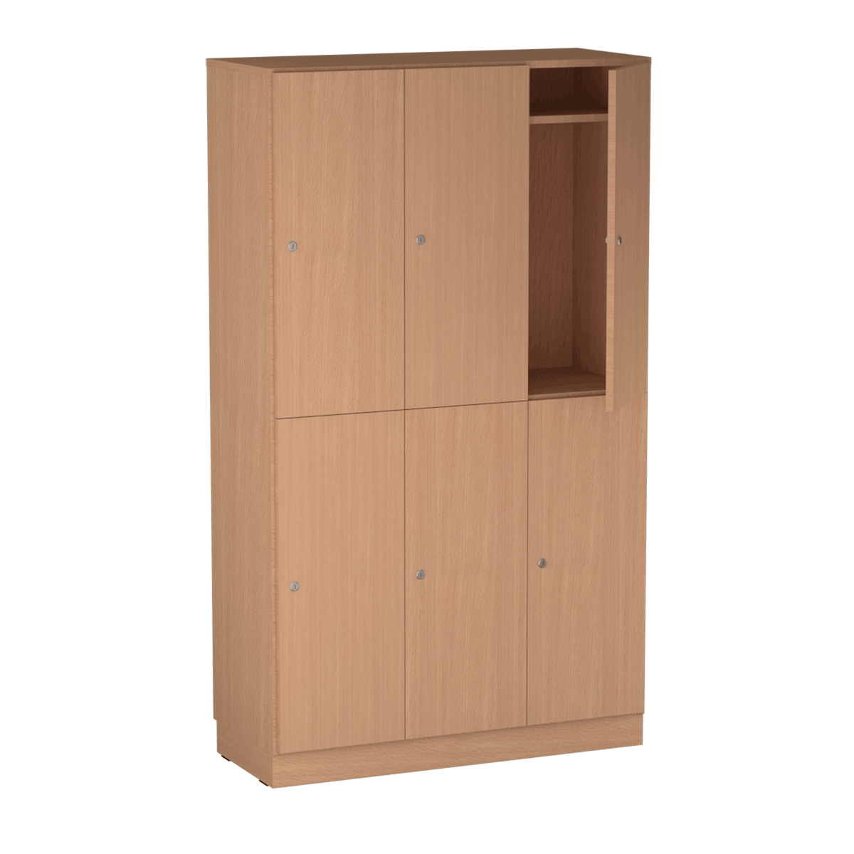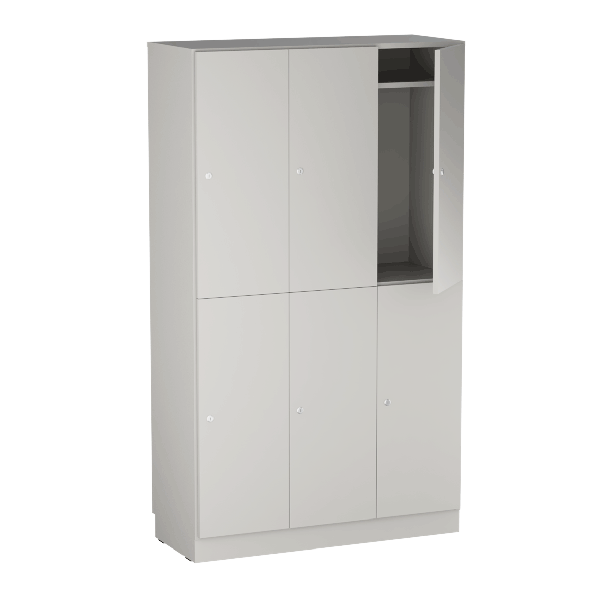 Personalskåpet är utrustat med sex separata fack som ger gott om plats för kläder, väskor och värdesaker. Den generösa bredden gör det möjligt att hänga upp ytterkläder och hålla ordning på personliga tillhörigheter.