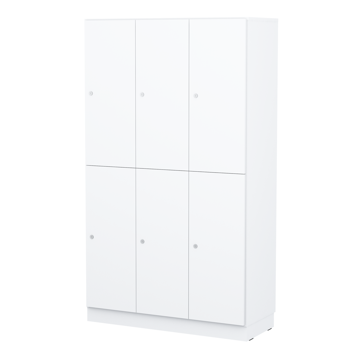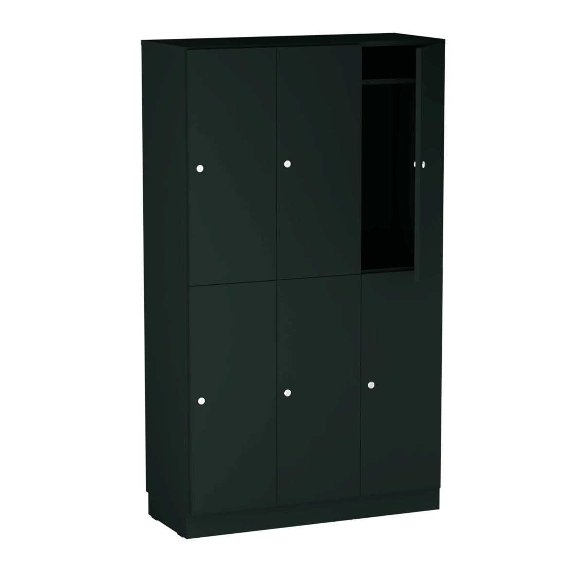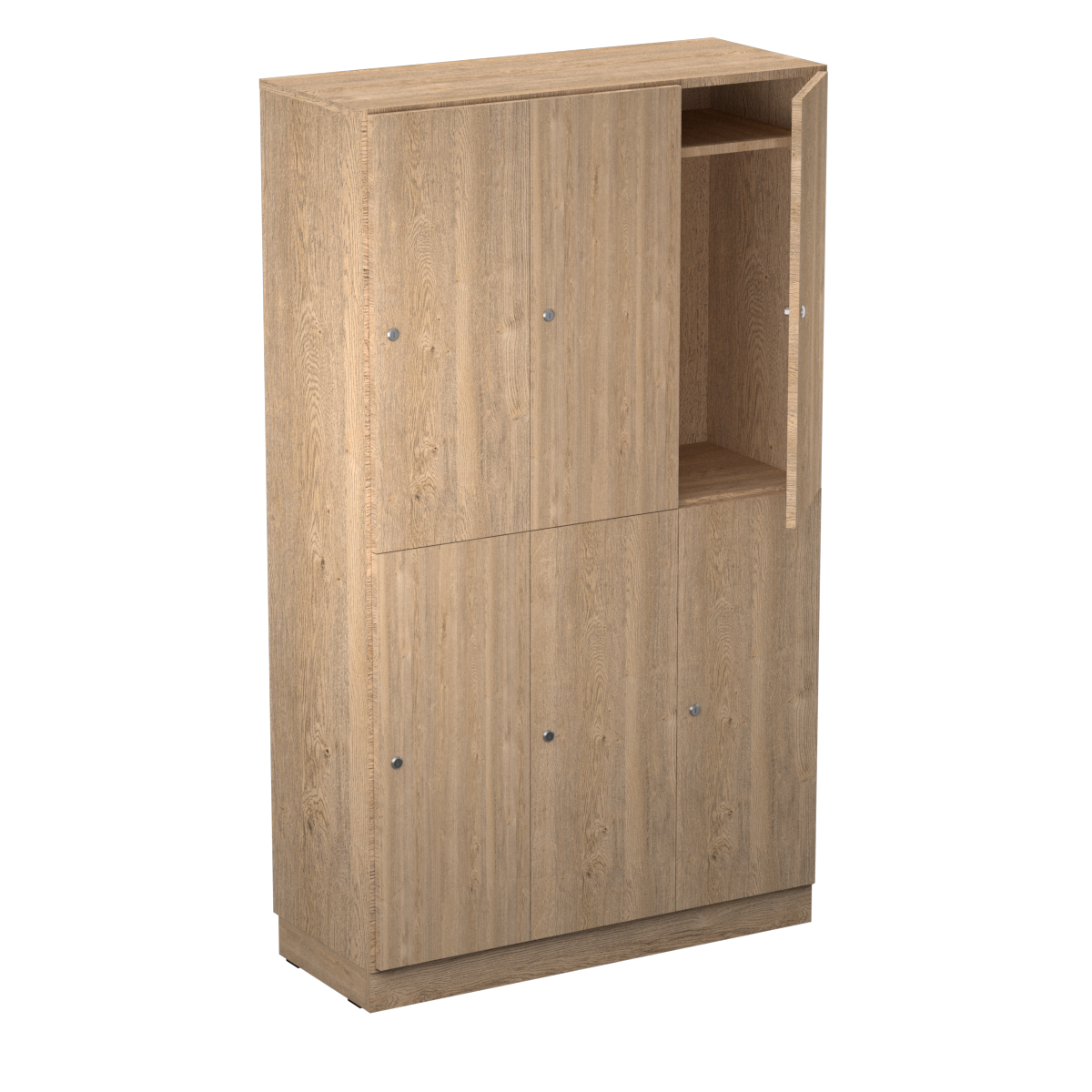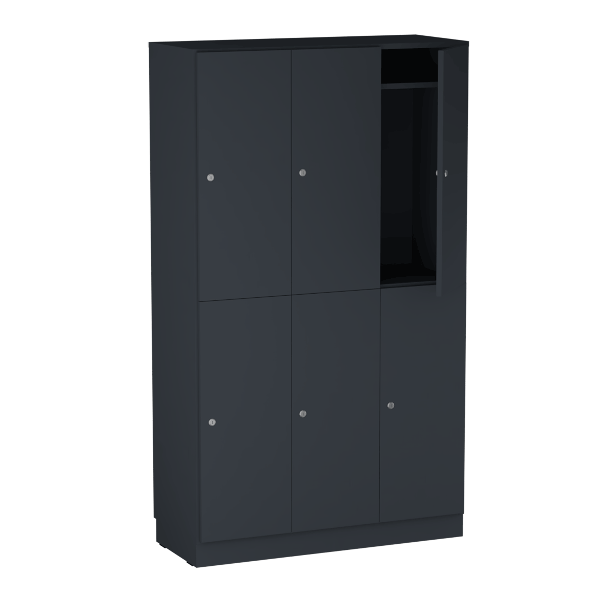 Personalskåpet är utrustat med sex separata fack som ger gott om plats för kläder, väskor och värdesaker. Den generösa bredden gör det möjligt att hänga upp ytterkläder och hålla ordning på personliga tillhörigheter.