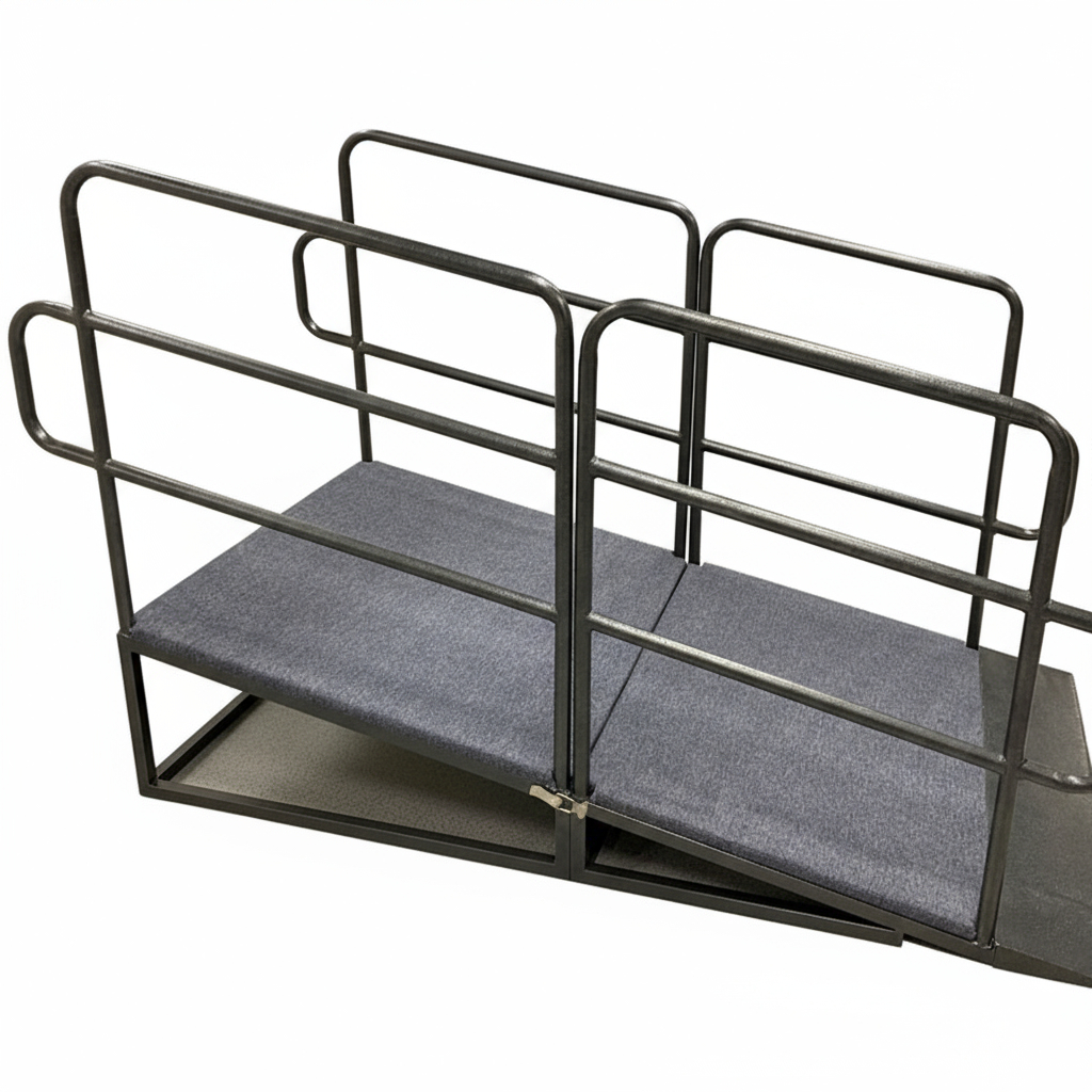 Denna scenramp gör det enkelt att skapa en tillgänglig entré till scenen. Oavsett om det handlar om uppträdanden, föreläsningar, bufféer eller utbildningar är rampen en lösning som förenklar för både deltagare och arrangörer. Rampen är särskilt anpassad för att underlätta för rullstolsbundna att smidigt ta sig upp på scenen.