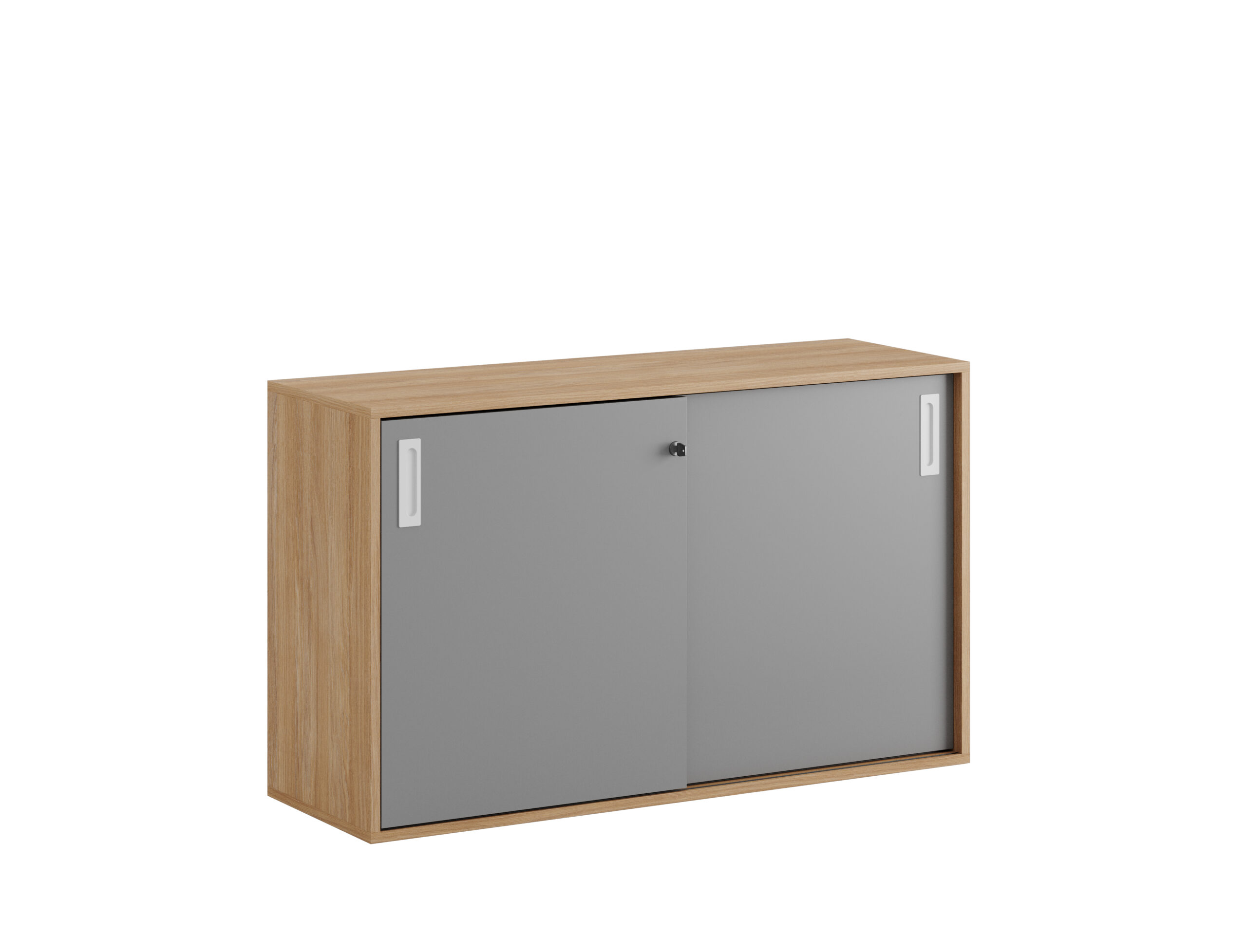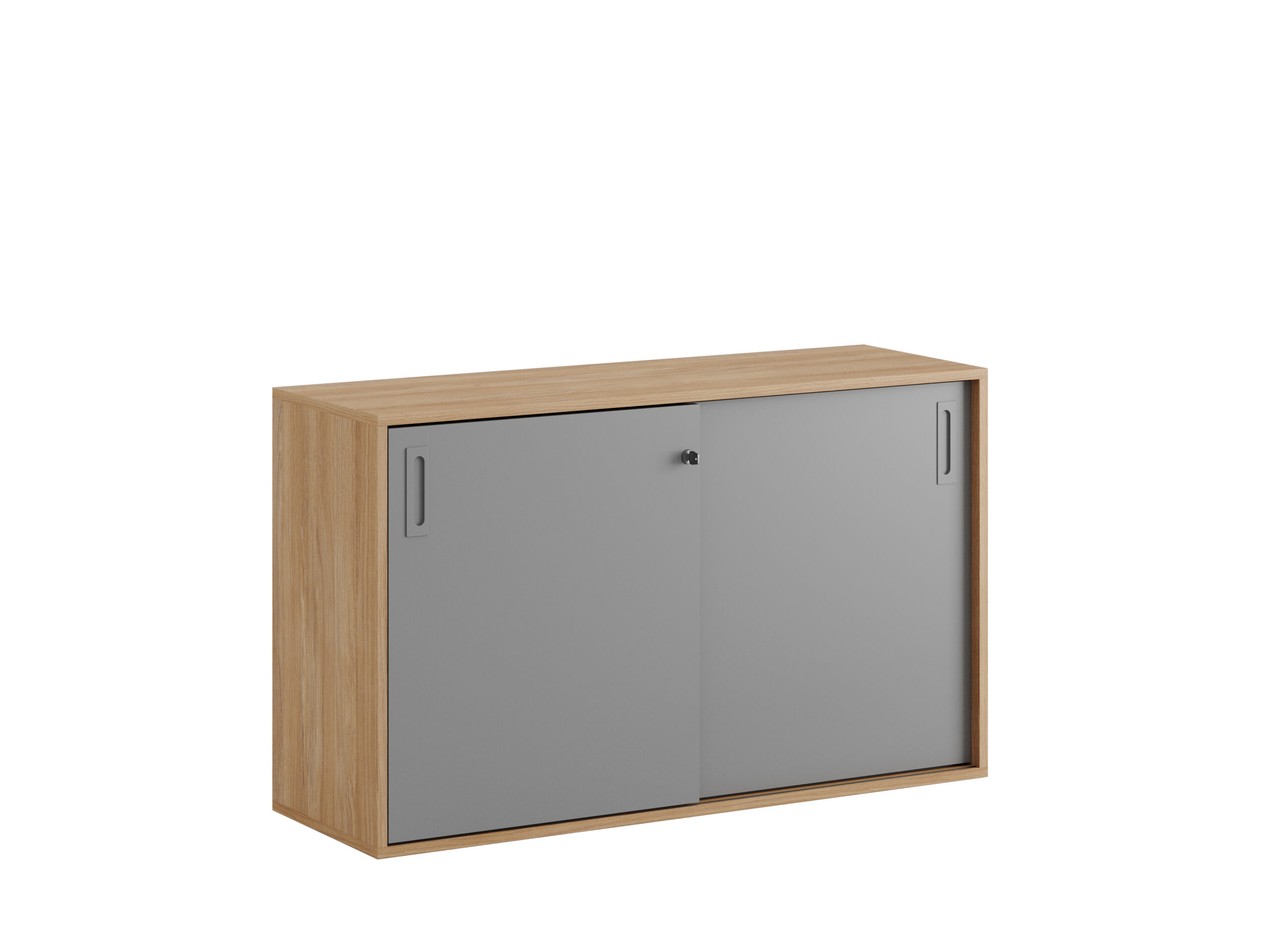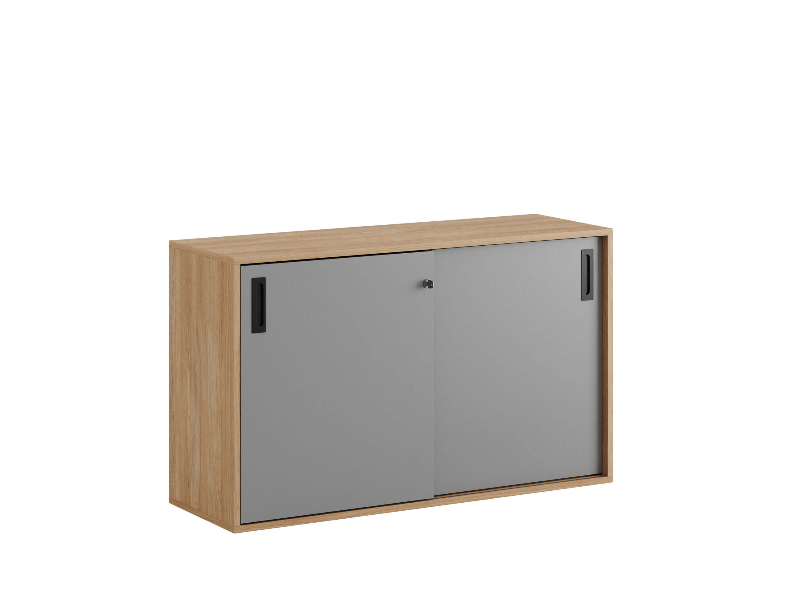 Skjutdörrskåp / dokumentskåp / kontors skåp i ek / urban oak stomme och skjutdörrar i grå, vit eller ek. Mått 120x40x72 cm. Småland serien för kunder som gillar nordisk stilren design. Välj mellan handtag i 3 färger. Skåpet rymmer 2 pärmar på höjden. Lås med 2 nycklar ingår.