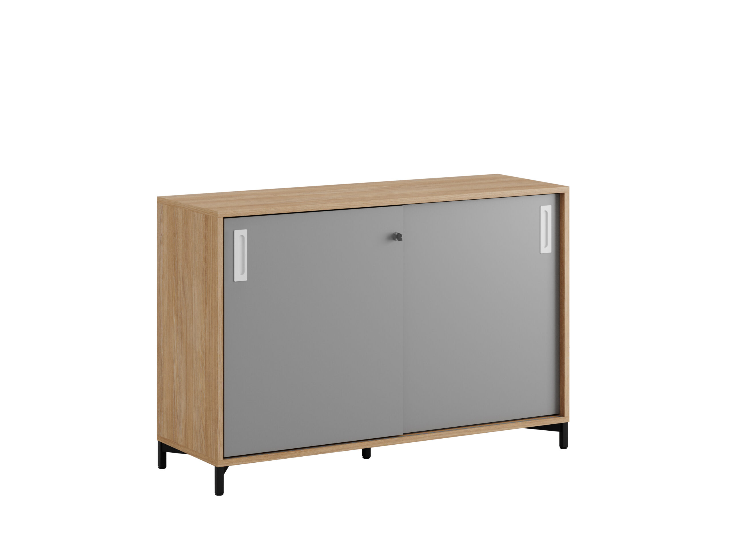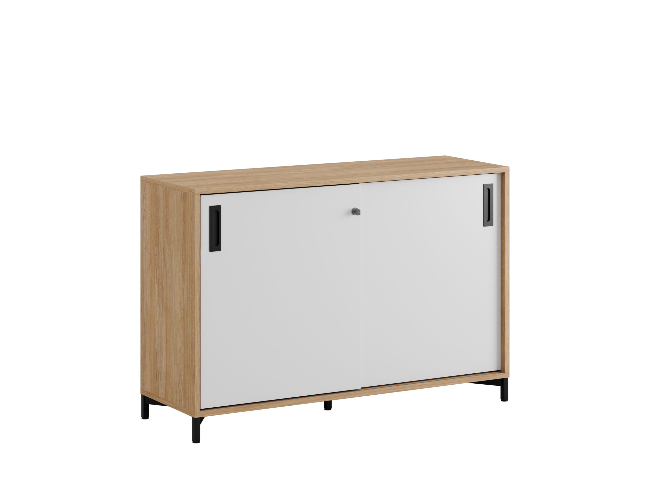 Skjutdörrskåp / dokumentskåp / kontors skåp i ek / urban oak stomme. Mått 120x40x80 cm. Småland serien för kunder som gillar nordisk stilren design. Välj mellan handtag i 3 färger. Skåpet rymmer 2 pärmar på höjden. Lås med 2 nycklar ingår.