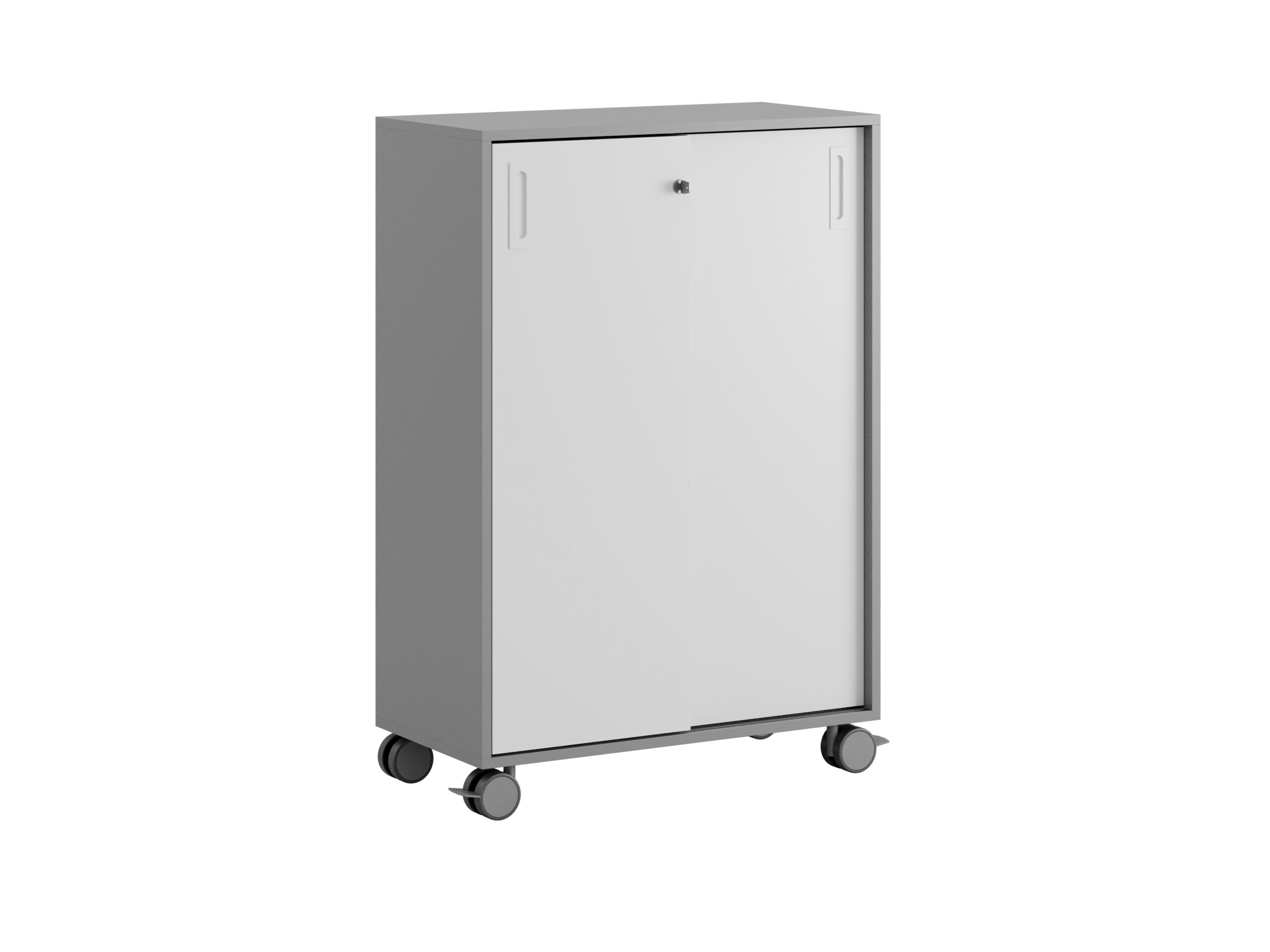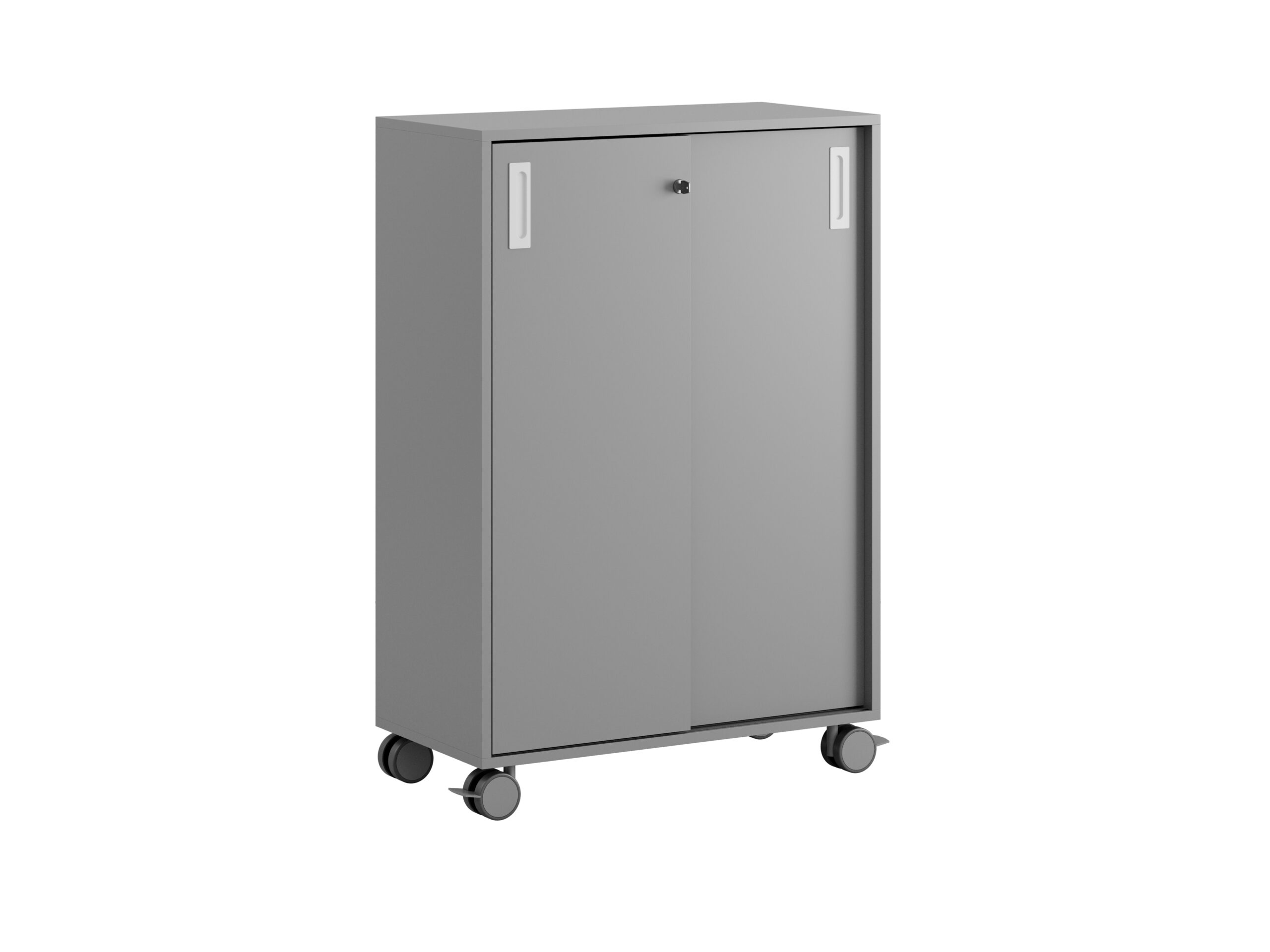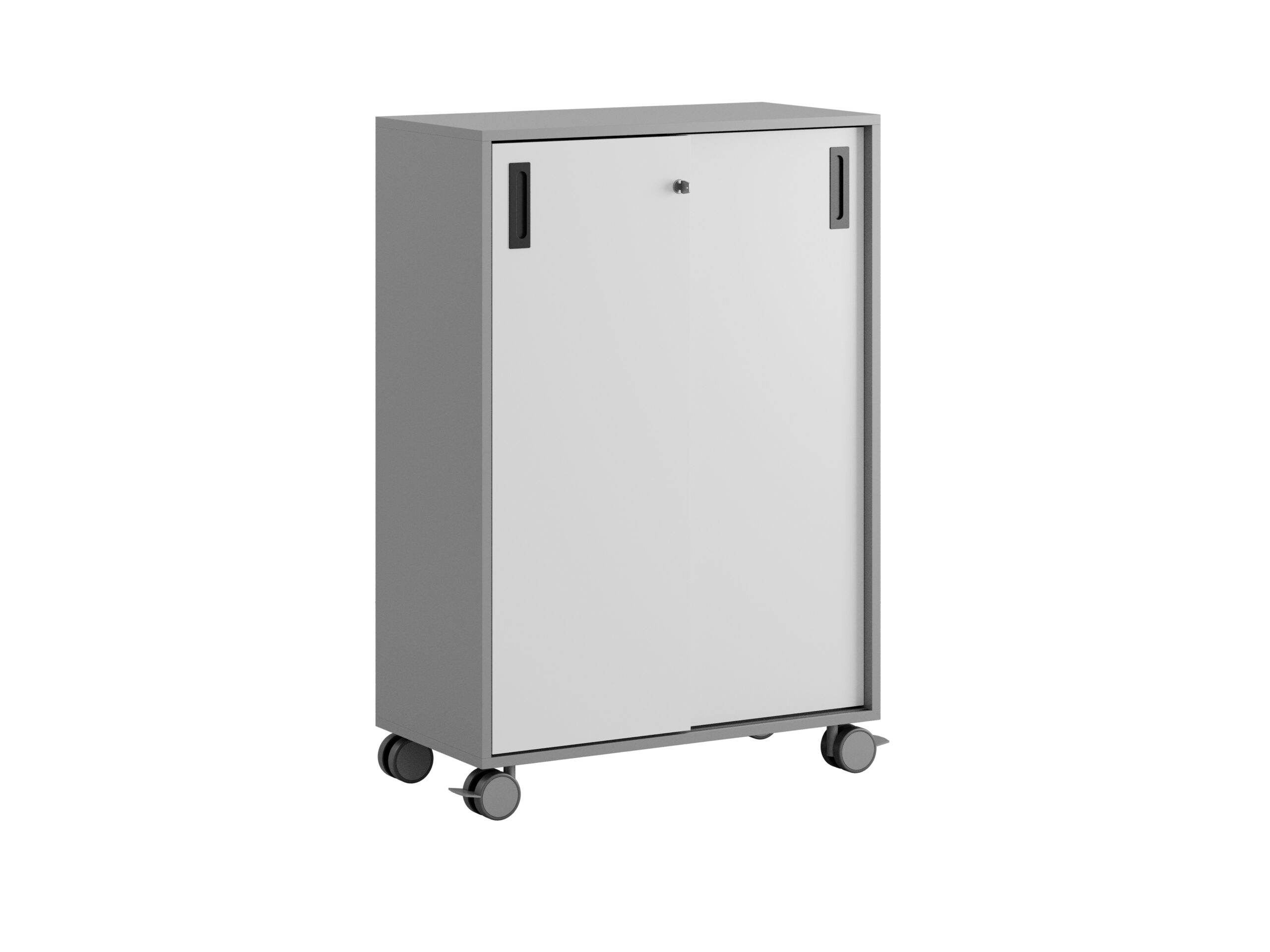 Skjutdörrarna gör det enkelt att nå allt innehåll utan att ta extra plats. Låset med två nycklar ger säker förvaring för kontorsmaterial och personliga tillhörigheter. Plastfötter och hjul Ø80 mm (varav två med stoppbroms) gör skåpet enkelt att flytta vid behov.