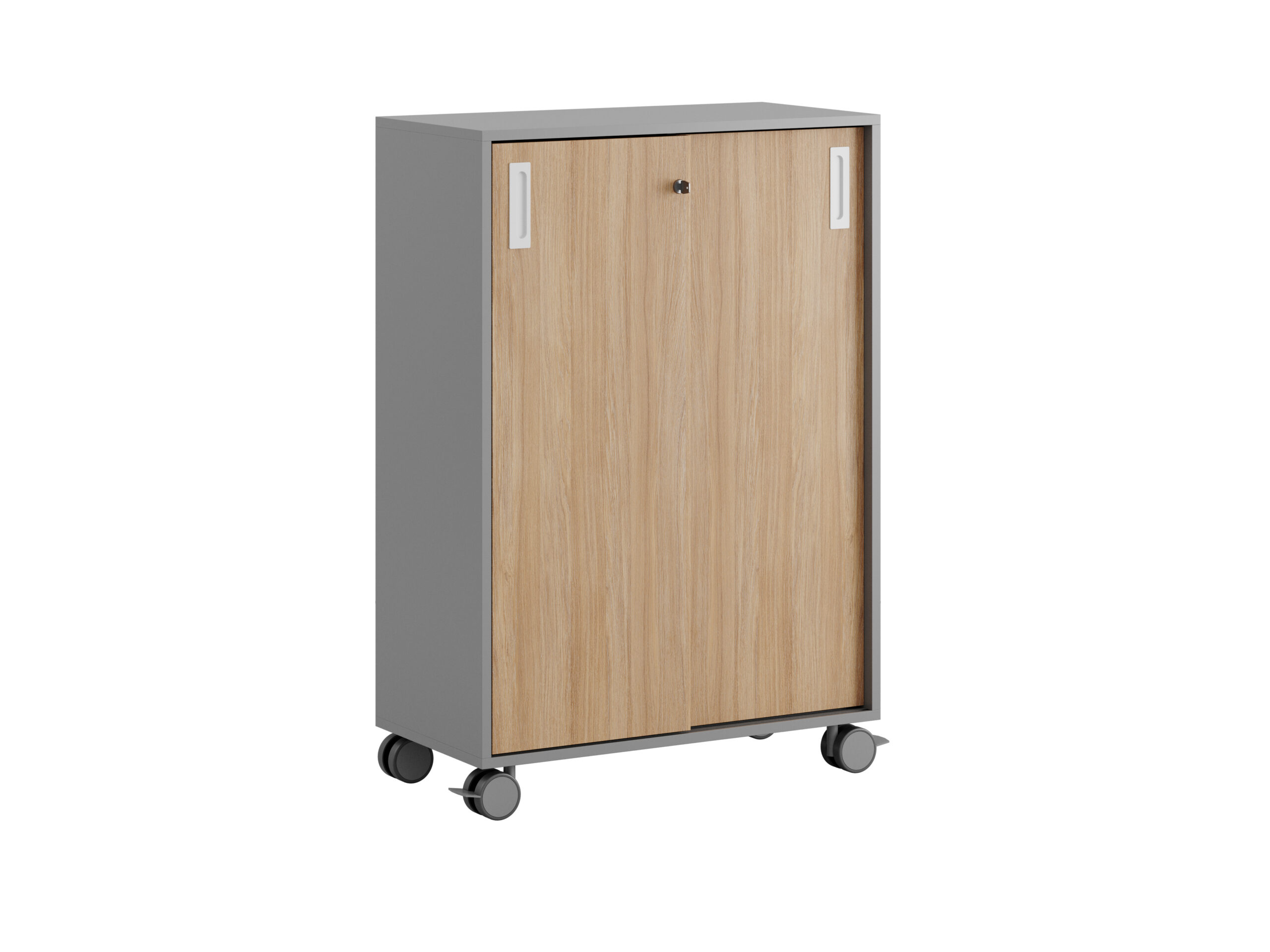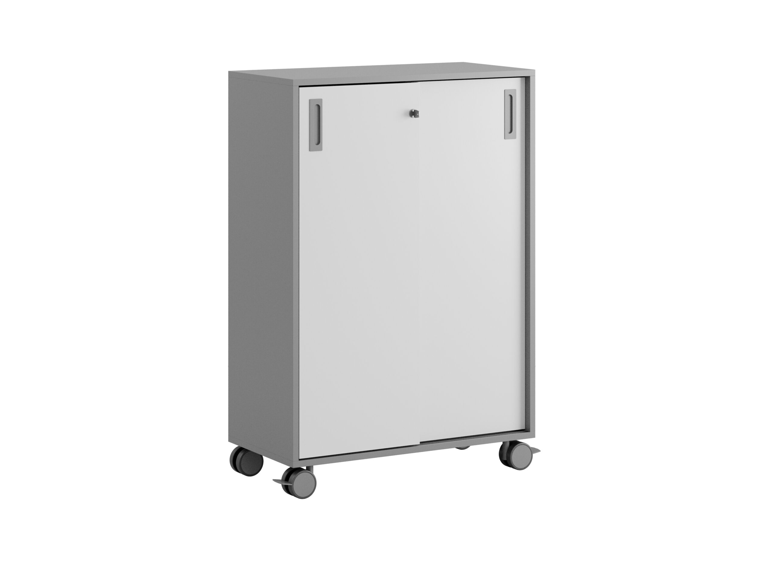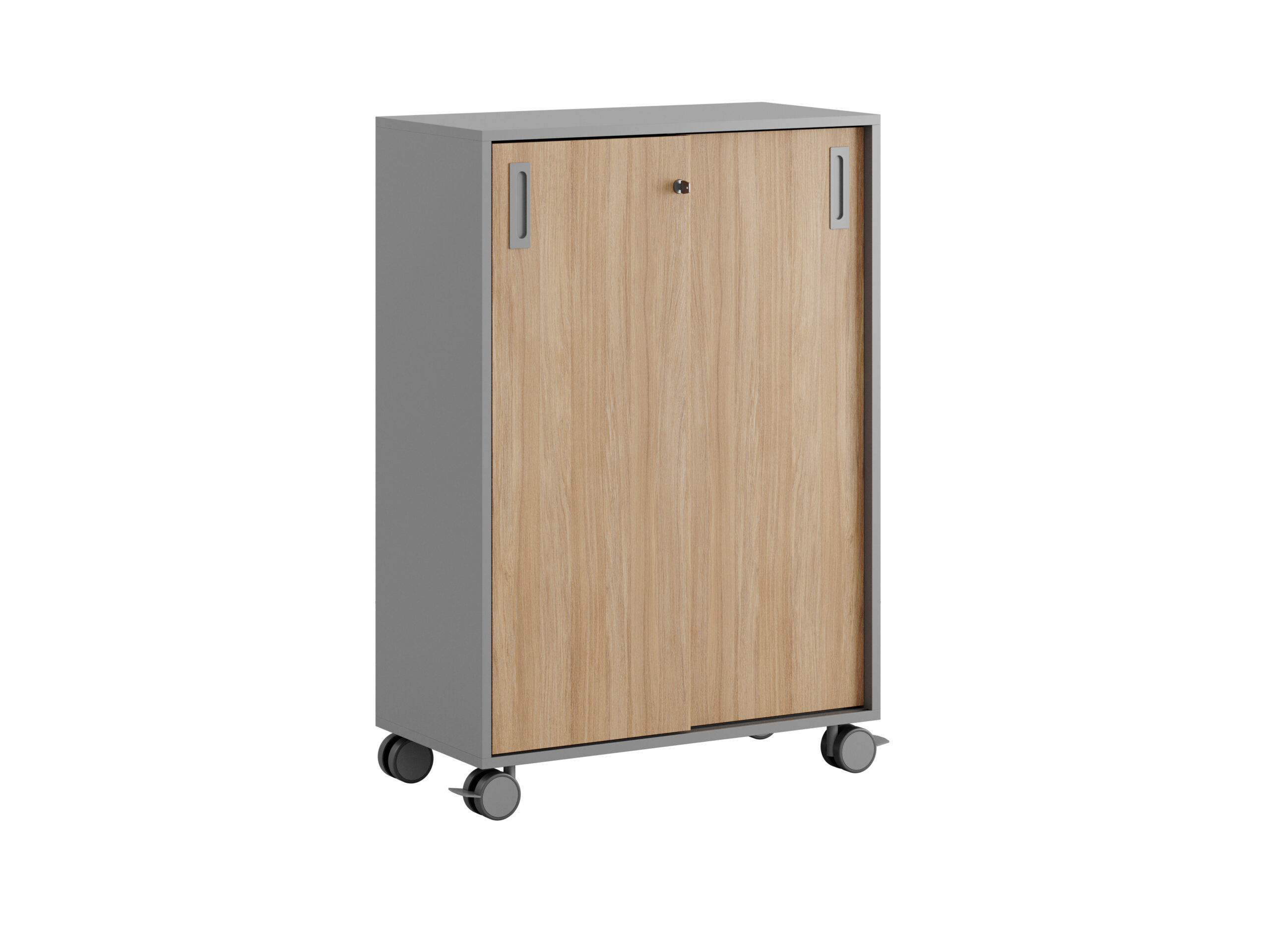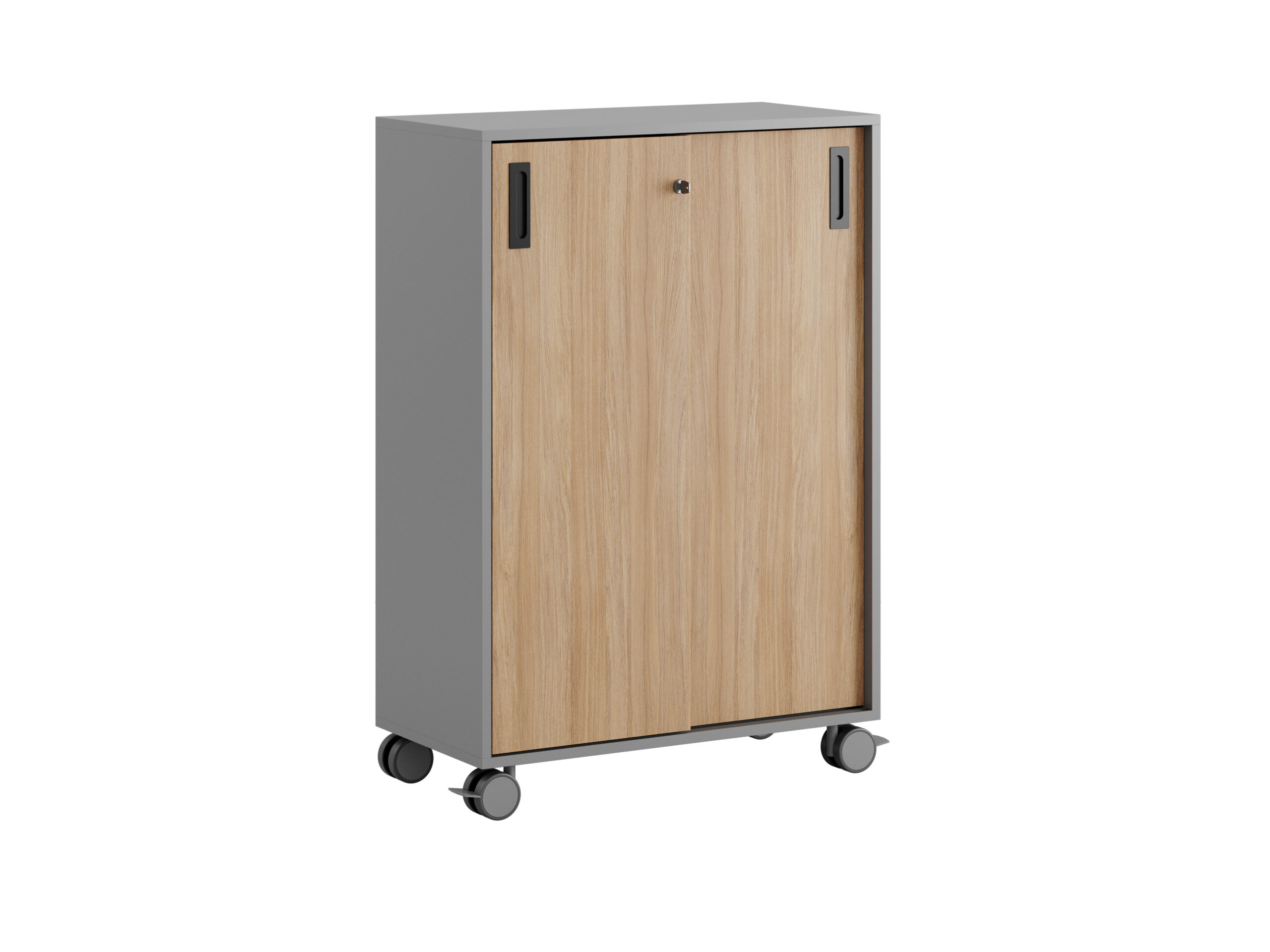 Skjutdörrarna gör det enkelt att nå allt innehåll utan att ta extra plats. Låset med två nycklar ger säker förvaring för kontorsmaterial och personliga tillhörigheter. Plastfötter och hjul Ø80 mm (varav två med stoppbroms) gör skåpet enkelt att flytta vid behov.
