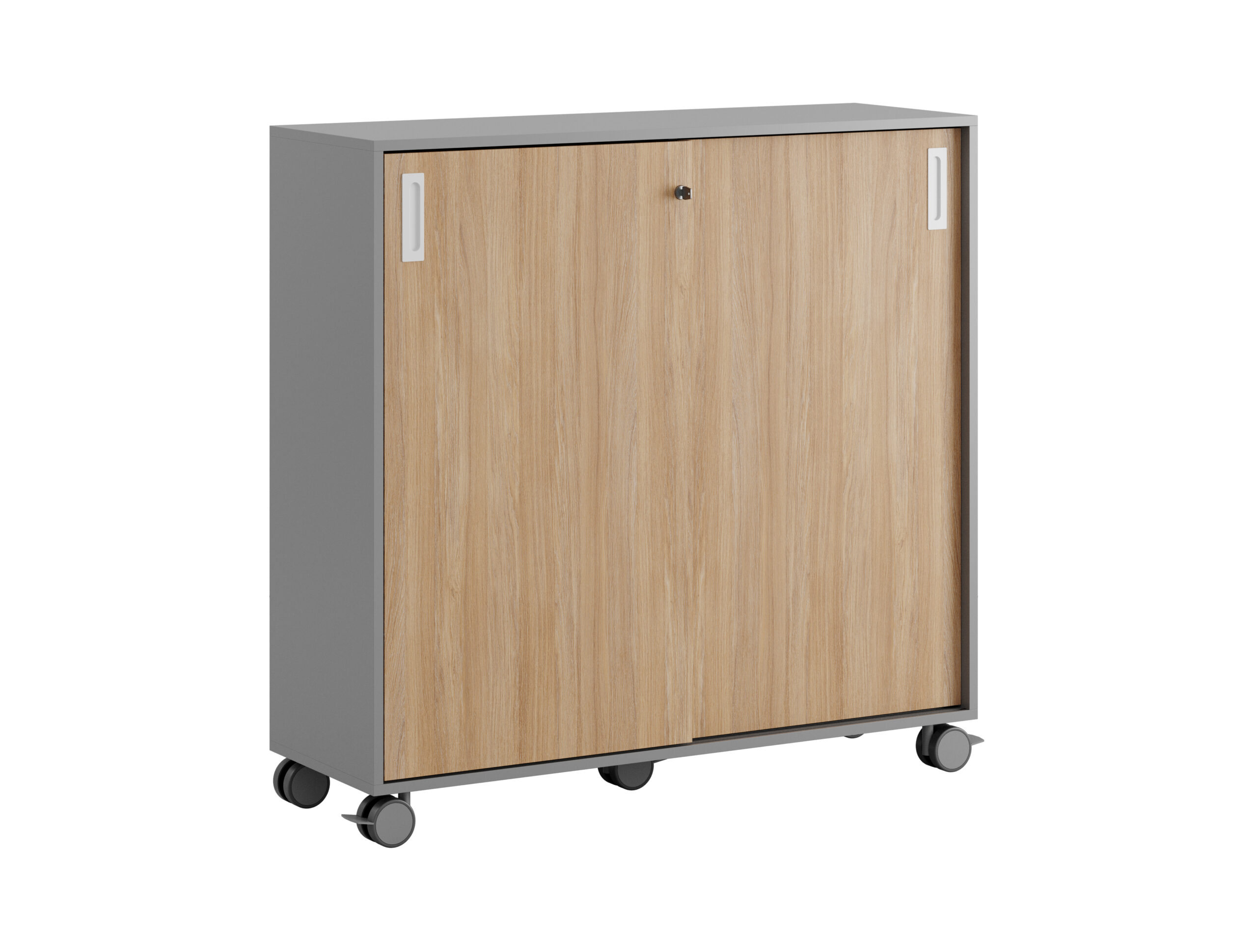 Skjutdörrskåp / dokumentskåp / kontors skåp i grå stomme och skjutdörrar i grå, vit eller ek. Med plastfötter. Mått 120x40x116 cm. Småland serien för kunder som gillar nordisk stilren design. Välj mellan handtag i 3 färger. Skåpet rymmer 3 pärmar på höjden. Lås med 2 nycklar ingår.