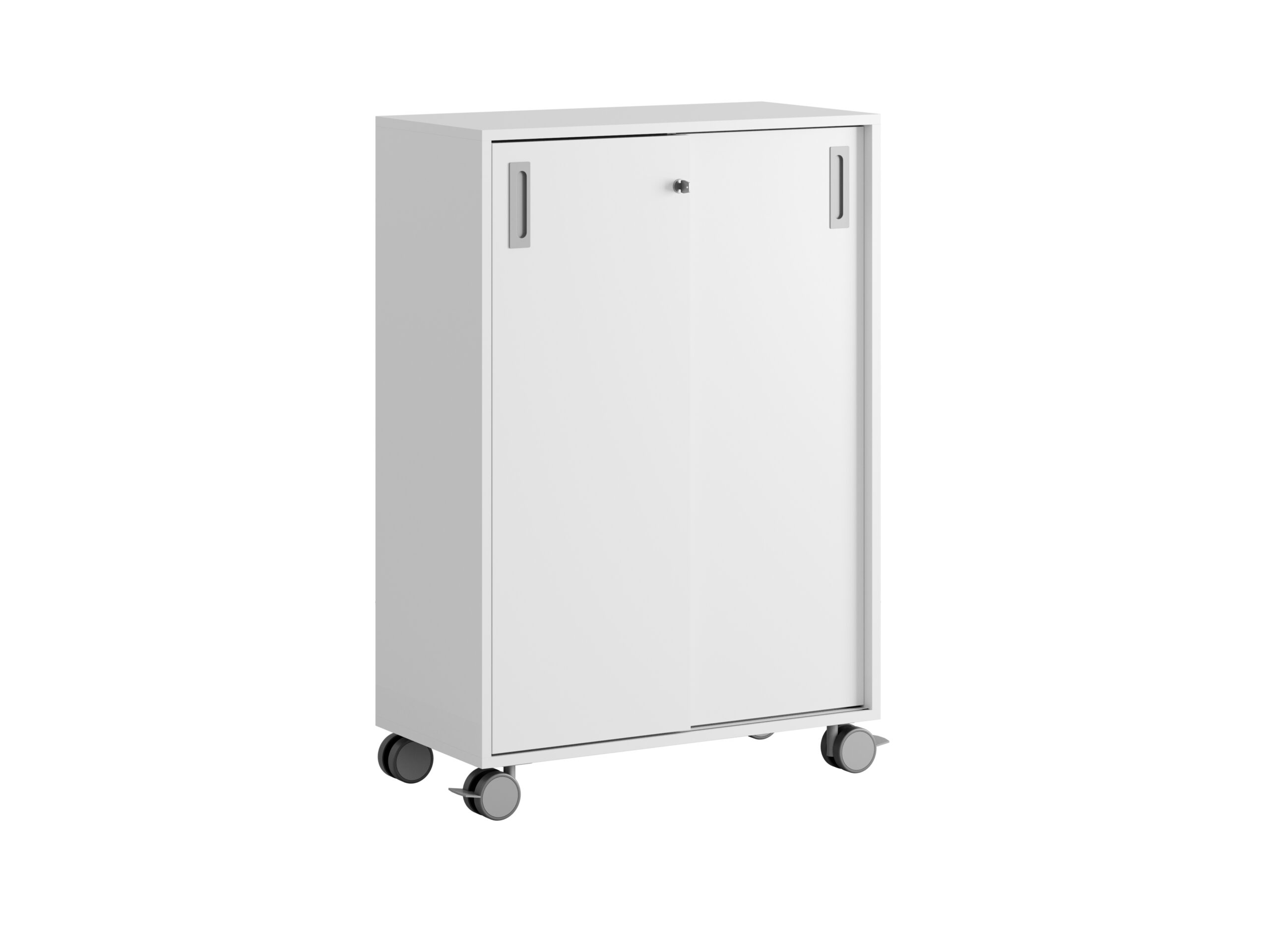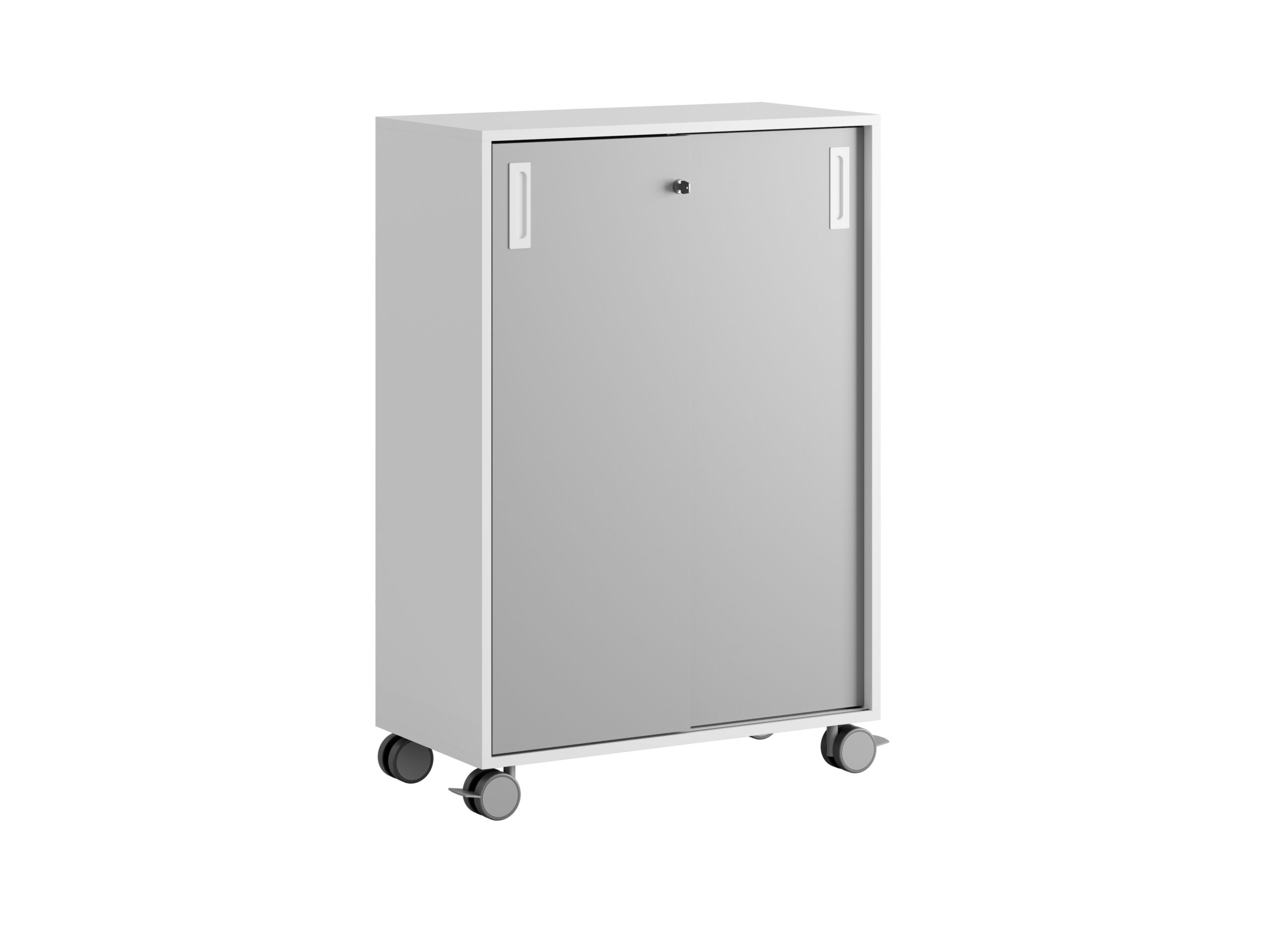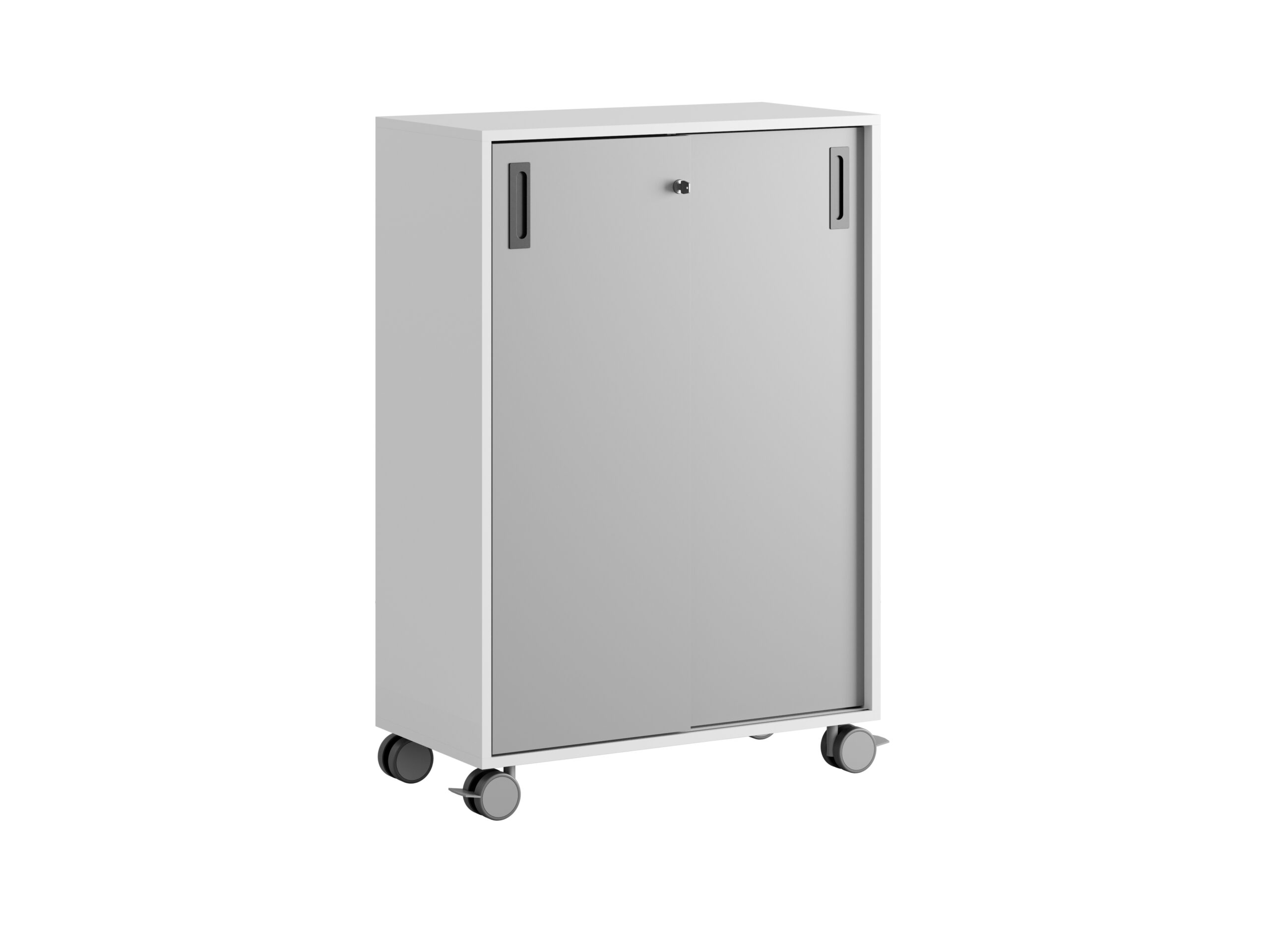 Skjutdörrarna gör det enkelt att nå innehållet utan att ta extra plats, och centrallåset med två nycklar ger säker förvaring av både dokument och personliga tillhörigheter. Plastfötter och hjul Ø80 mm (varav två med stoppbroms) gör skåpet enkelt att flytta vid behov.