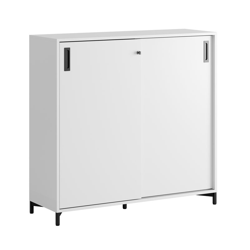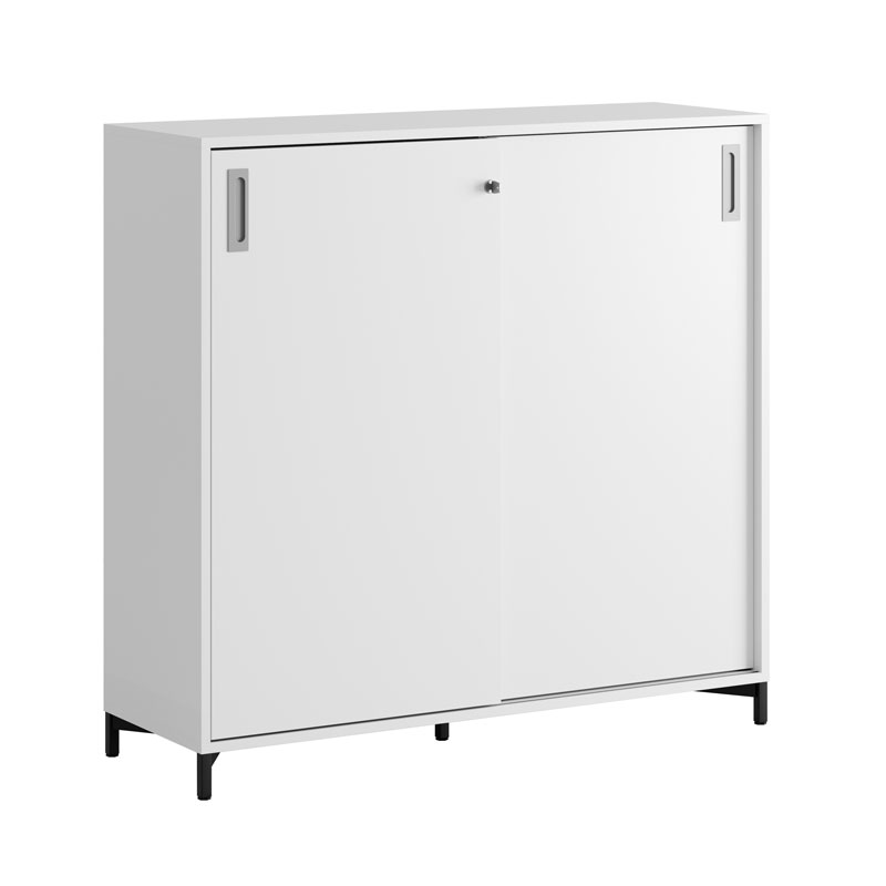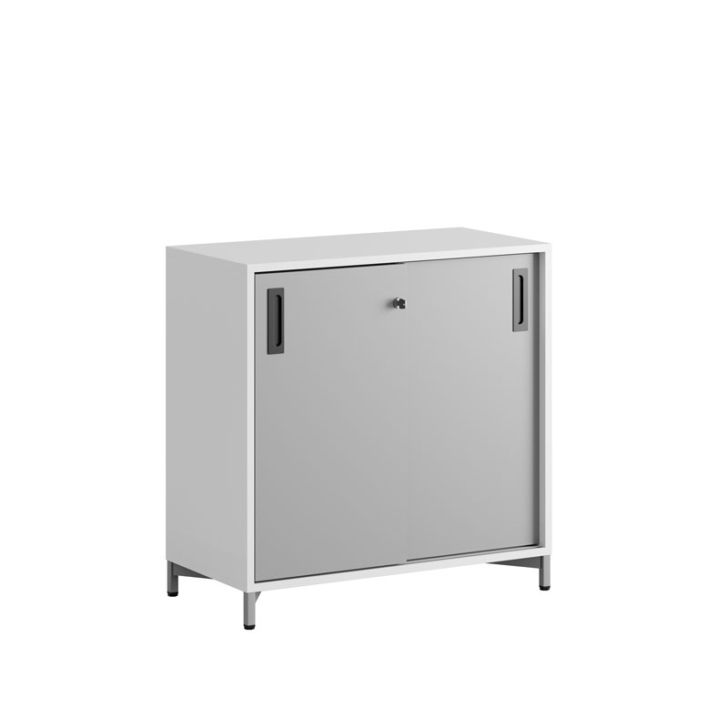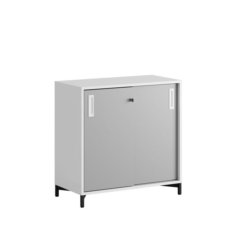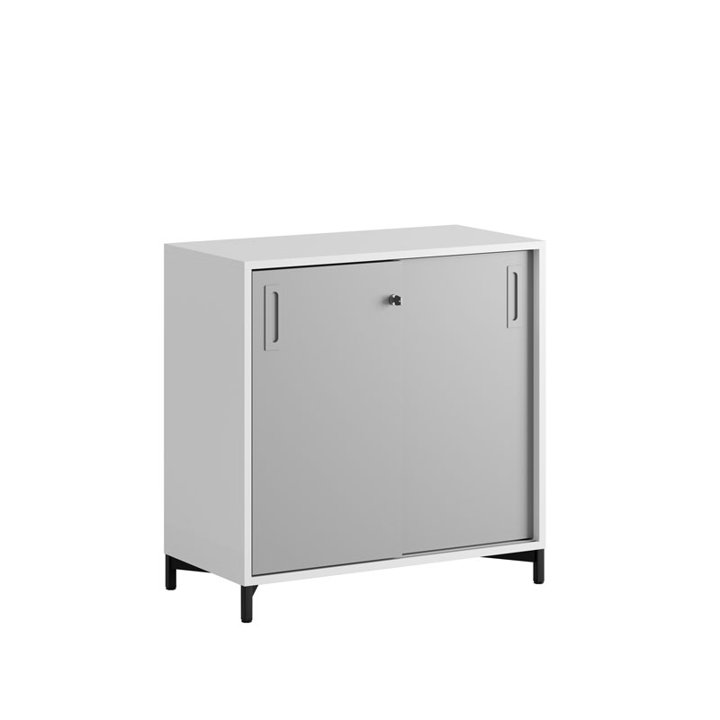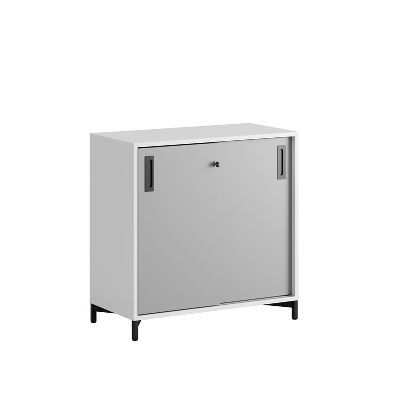 Skjutdörrskåp / dokumentskåp / kontors skåp i vit stomme och skjutdörrar i grå, vit eller ek. Med metallfötter Mått 120x40x115,5 cm. Småland serien för kunder som gillar nordisk stilren design. Välj mellan handtag i 3 färger. Skåpet rymmer 3 pärmar på höjden. Lås med 2 nycklar ingår.Metallfötterna är 80 mm höga och tillverkade med 20×20 mm metallrör. Metallfötterna är pulverlackerade och har integrerade plastben med höjdjustering +10 mm.