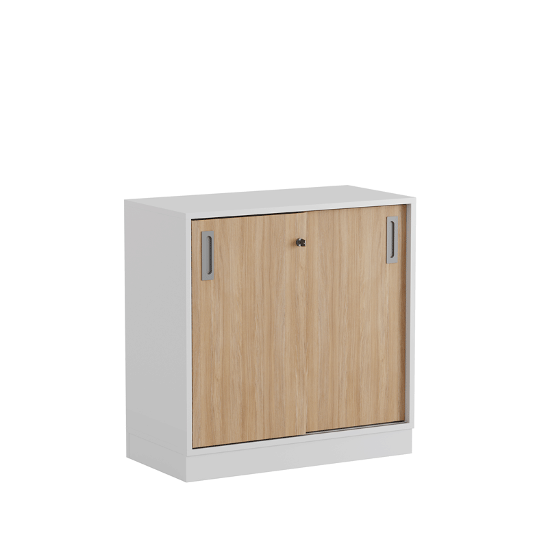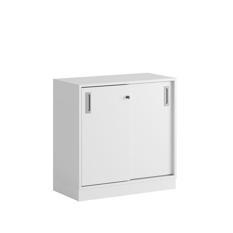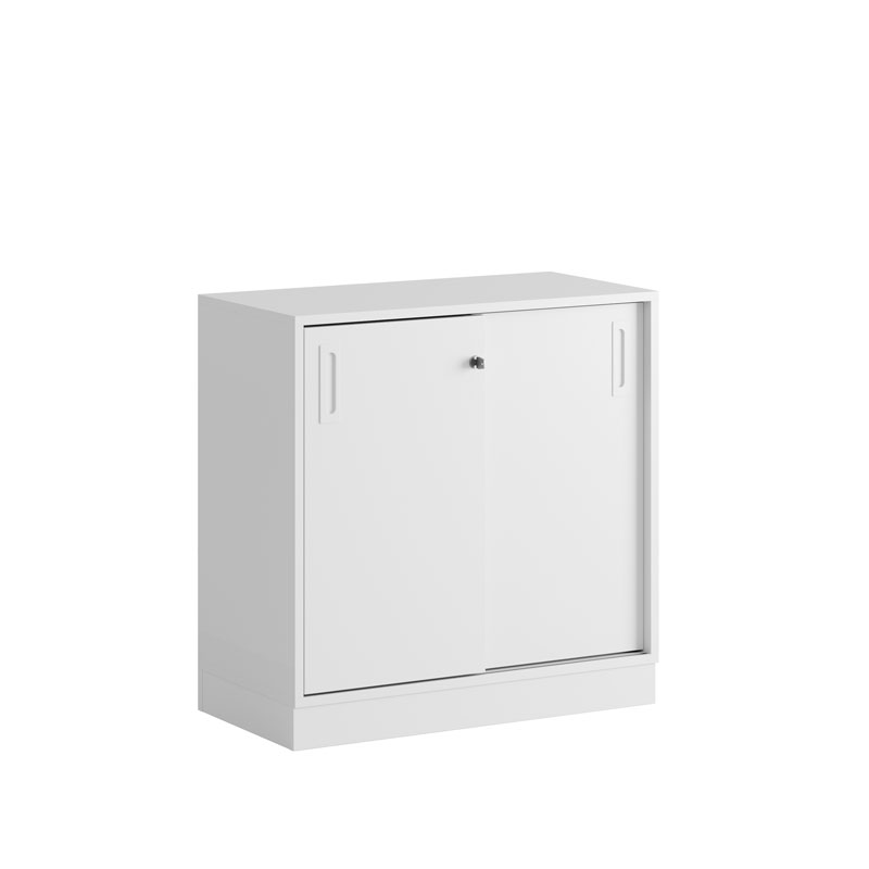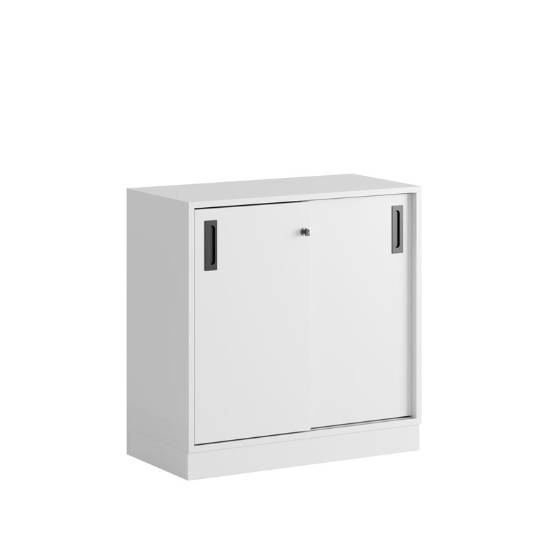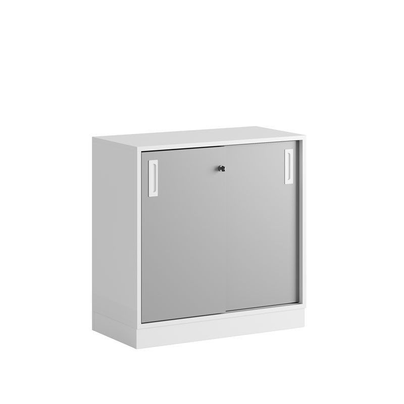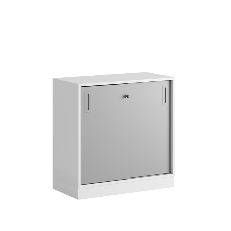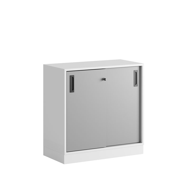 De praktiska skjutdörrarna öppnas smidigt utan att ta extra plats, vilket gör skåpet idealiskt i alla typer av kontorsmiljöer.