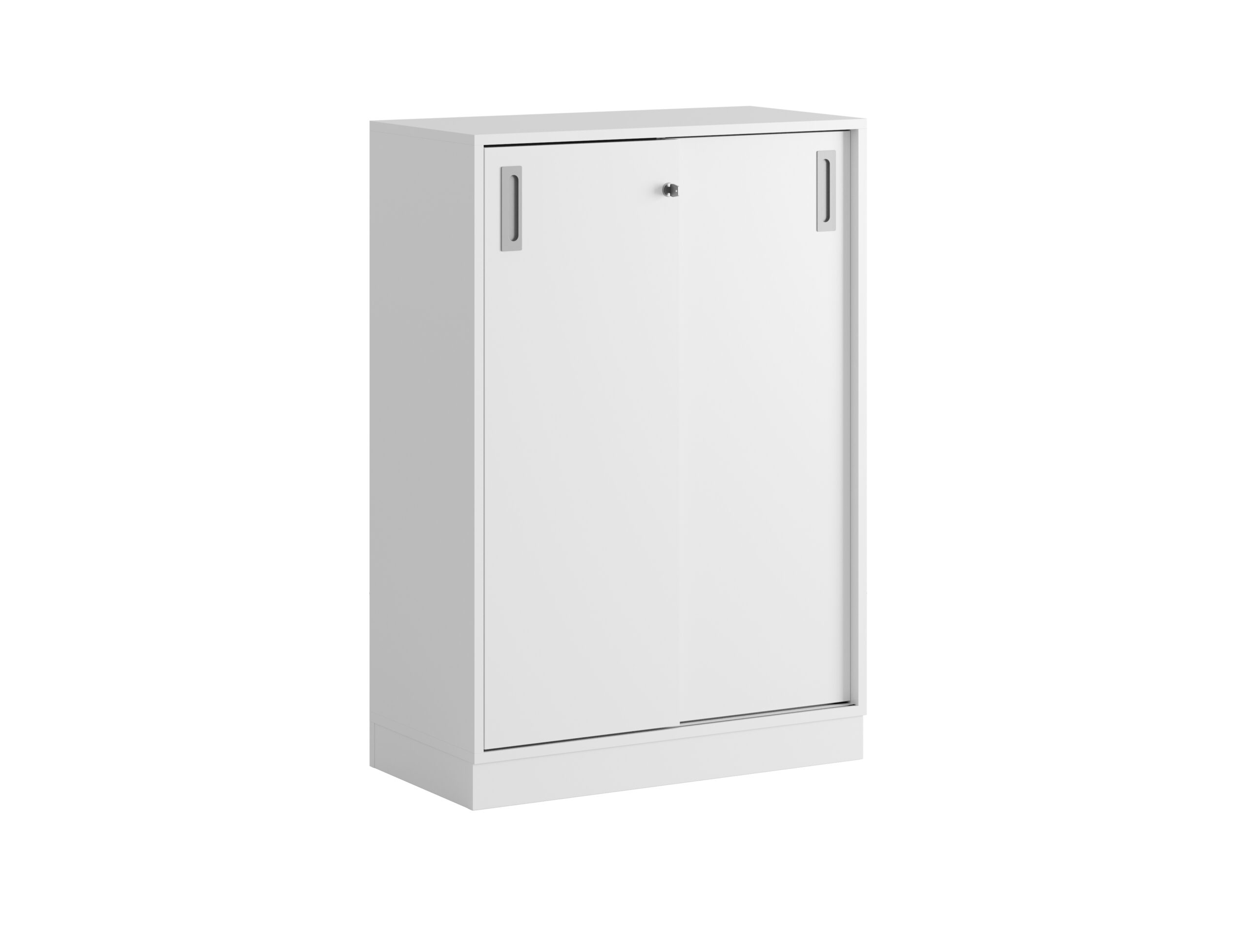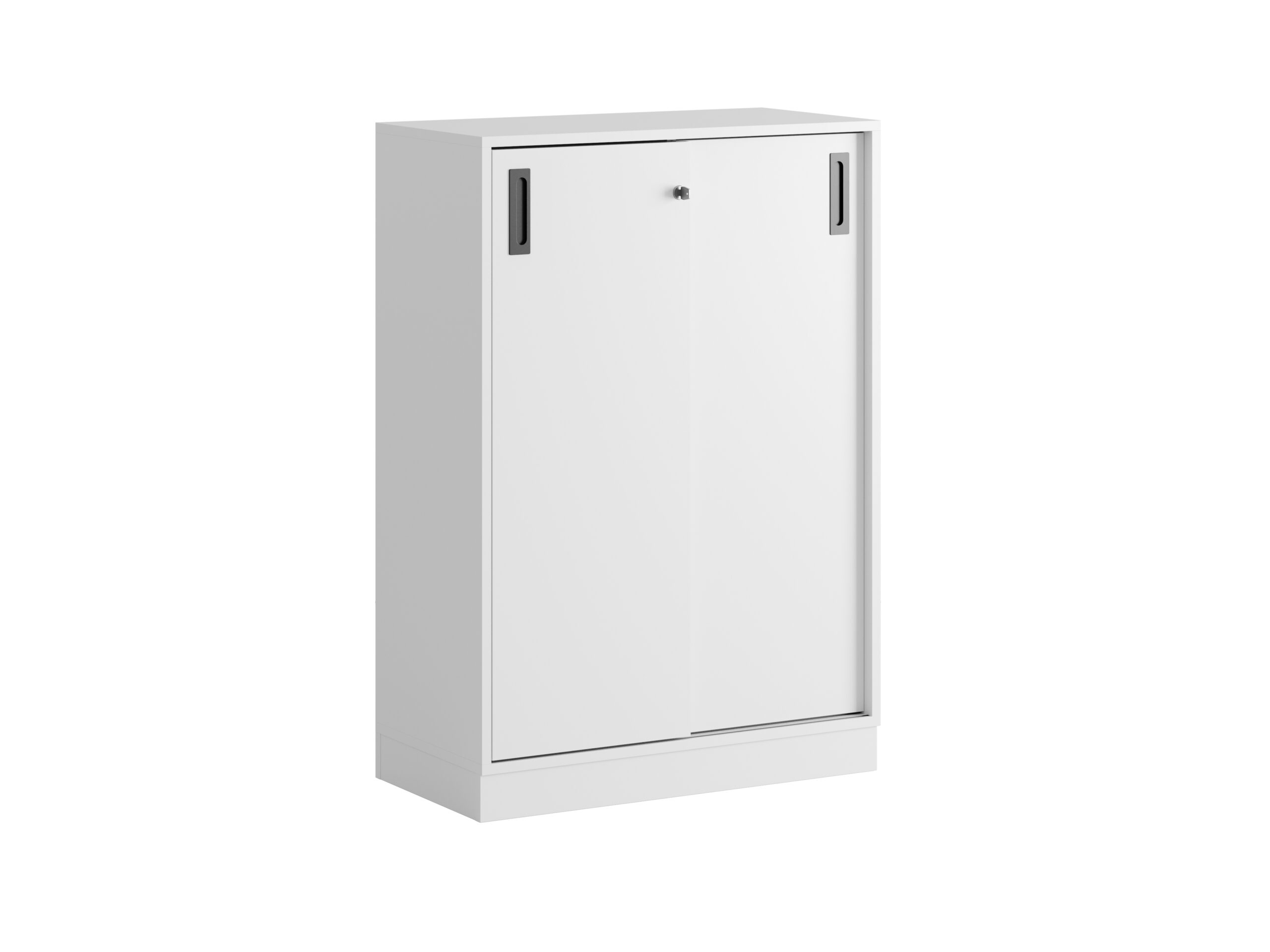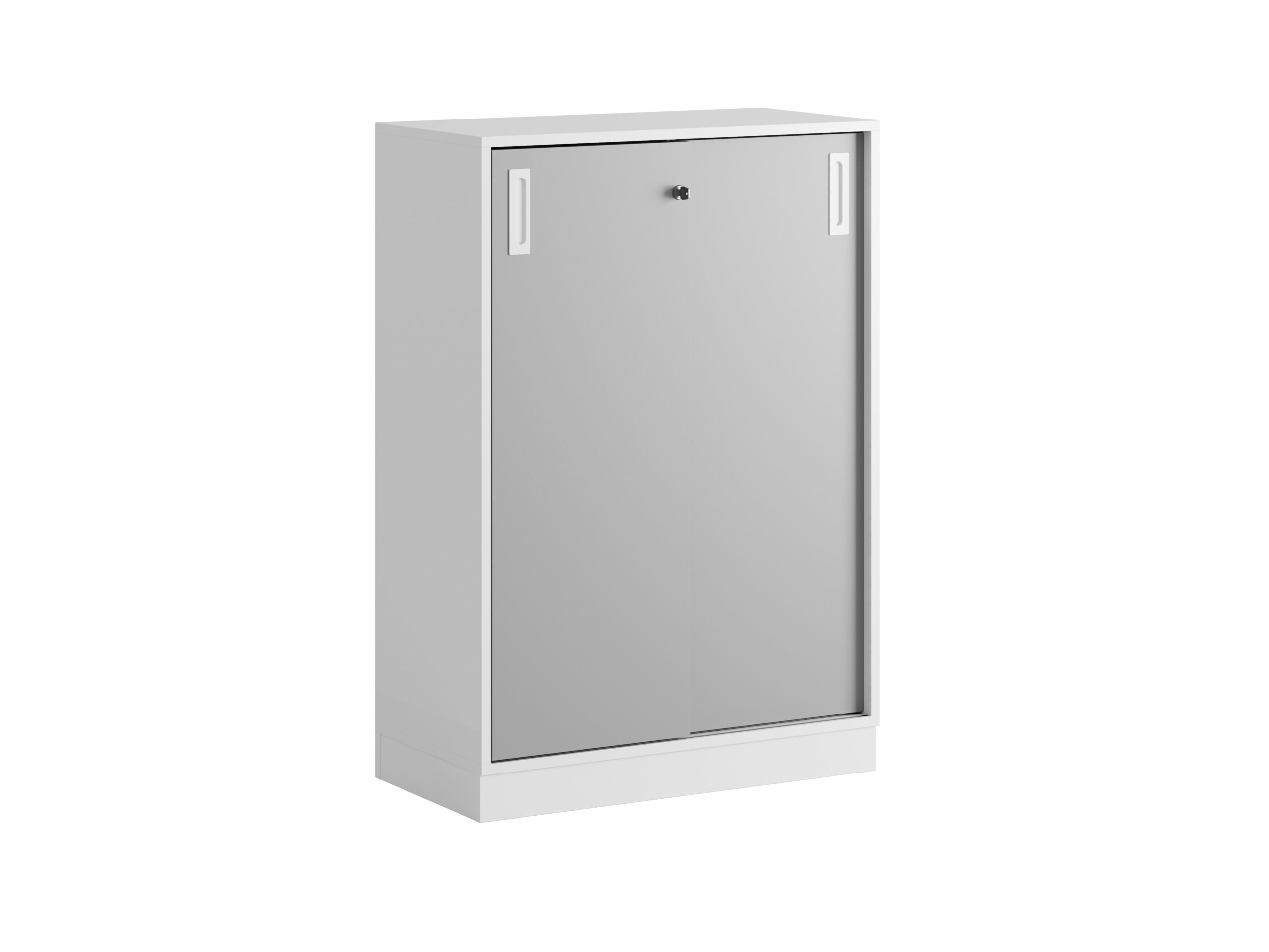 Skjutdörrarna frigör utrymme jämfört med traditionella dörrar och gör det enkelt att nå innehållet. Låset med två nycklar ger säker förvaring för dokument och personliga tillhörigheter. Sockeln levereras ej monterad för att undvika fraktskador.