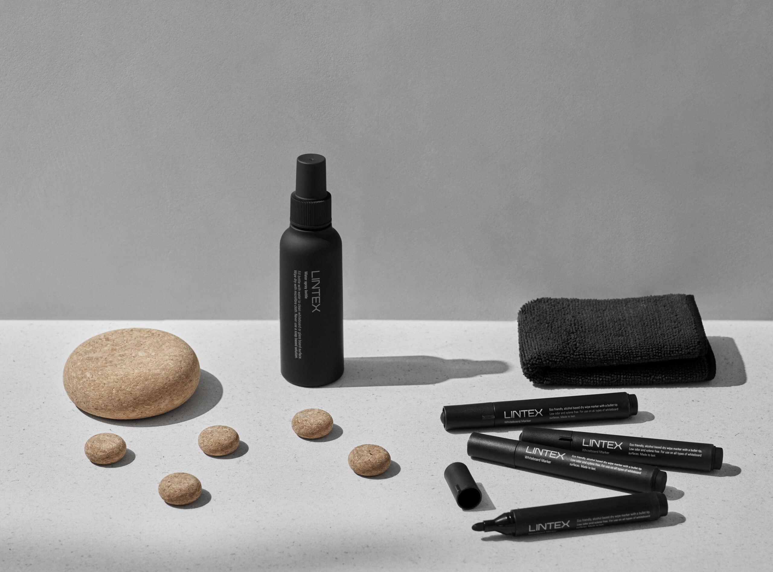 Startset i kork eller björk. Varje set innehåller fyra pennor, fem magneter, sprayflaska för rengöring med vatten, tavelsudd, fem filtar, en microfiberduk och fyra magnetiska singelpennhållare.