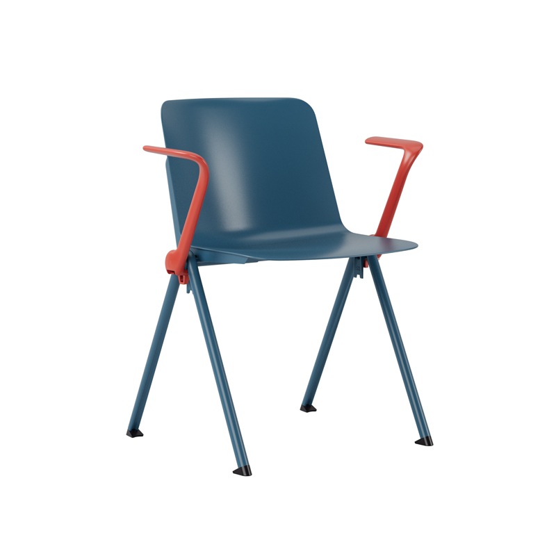 Stolen finns med V-formade stålben i flera färger samt skal i ett brett urval av kulörer. Detta ger stora möjligheter att skapa en enhetlig eller varierad möblering beroende på rummets funktion och karaktär.