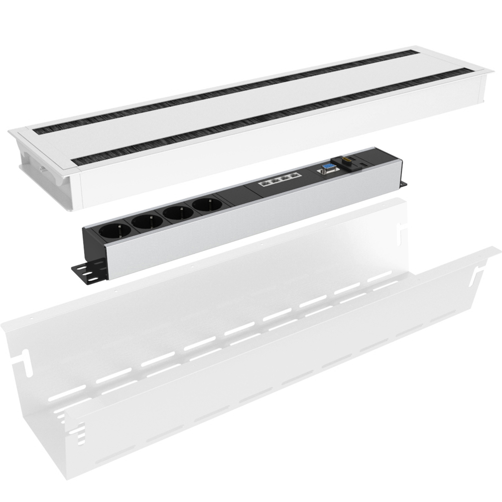 Axessline konferenspaket – stort innehåller alla komponenter som behövs för en diskret och funktionell installation direkt i bordsskivan.